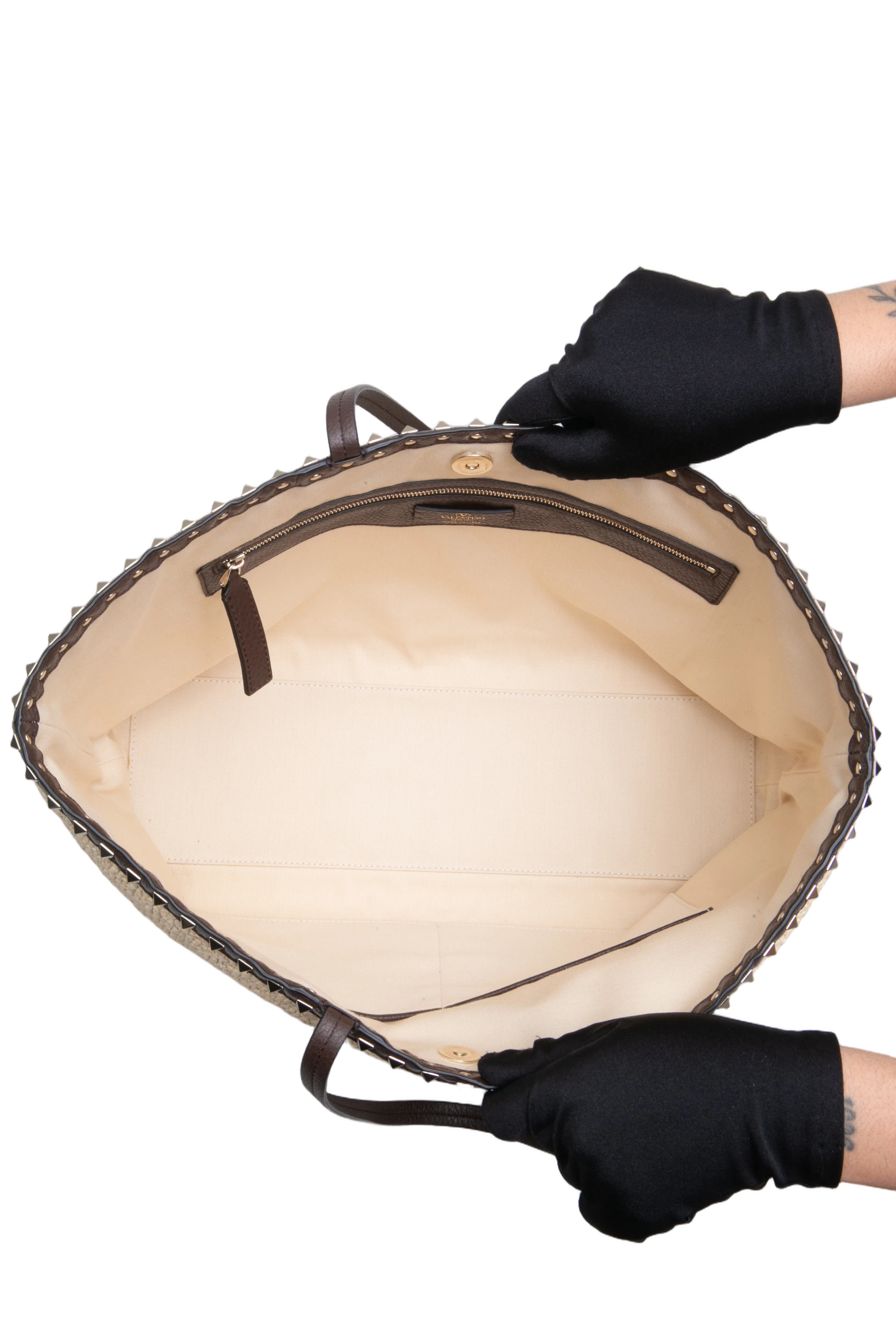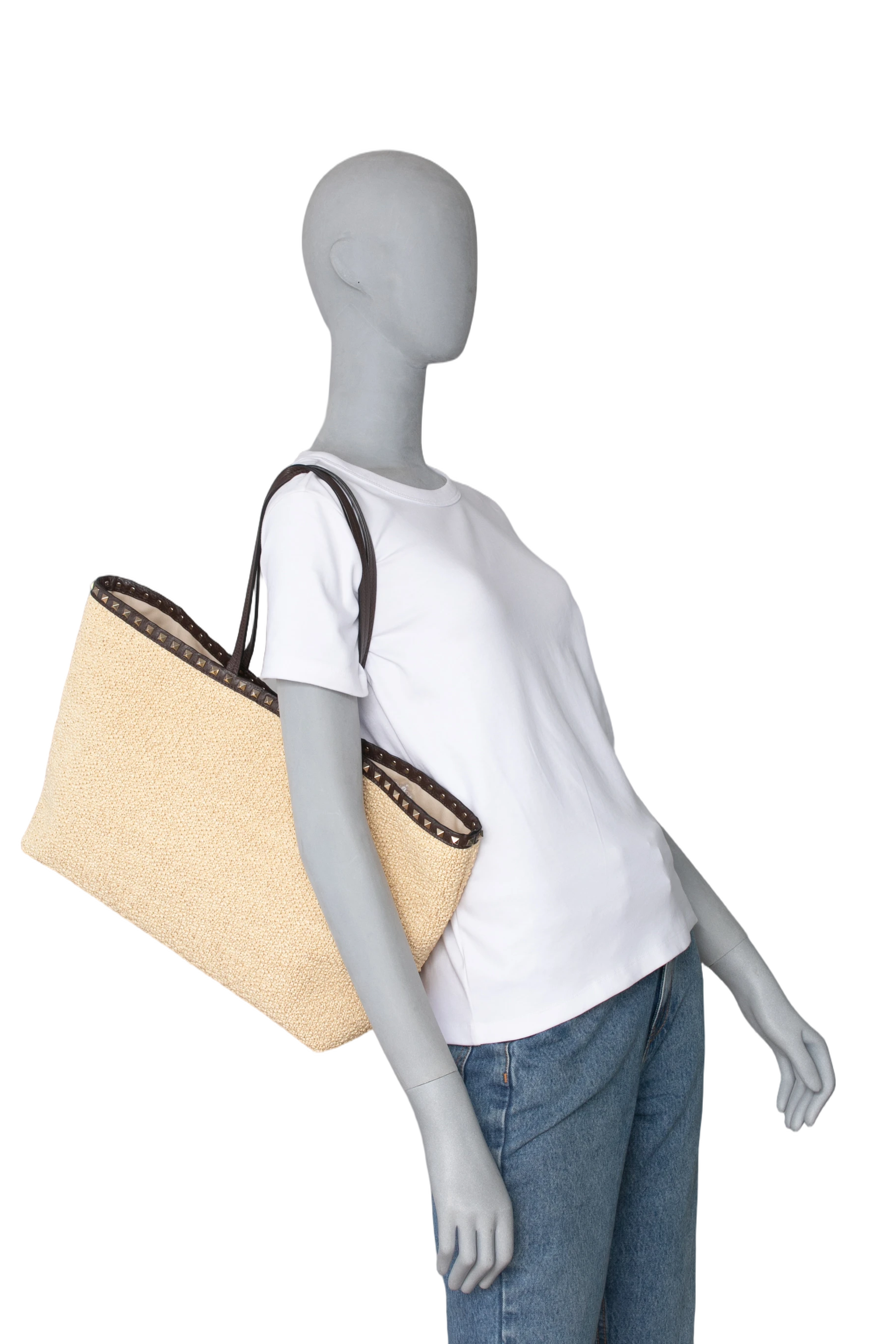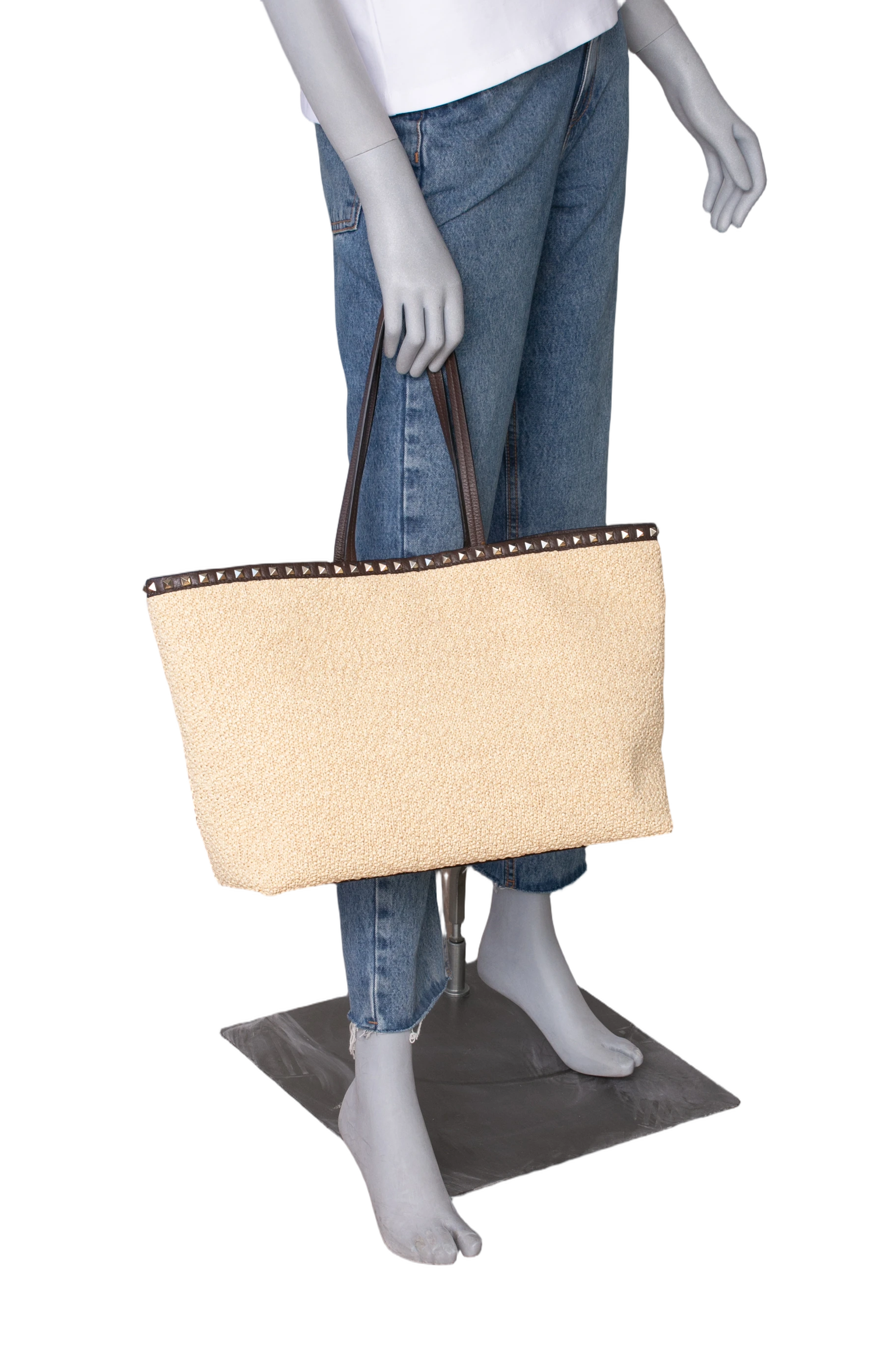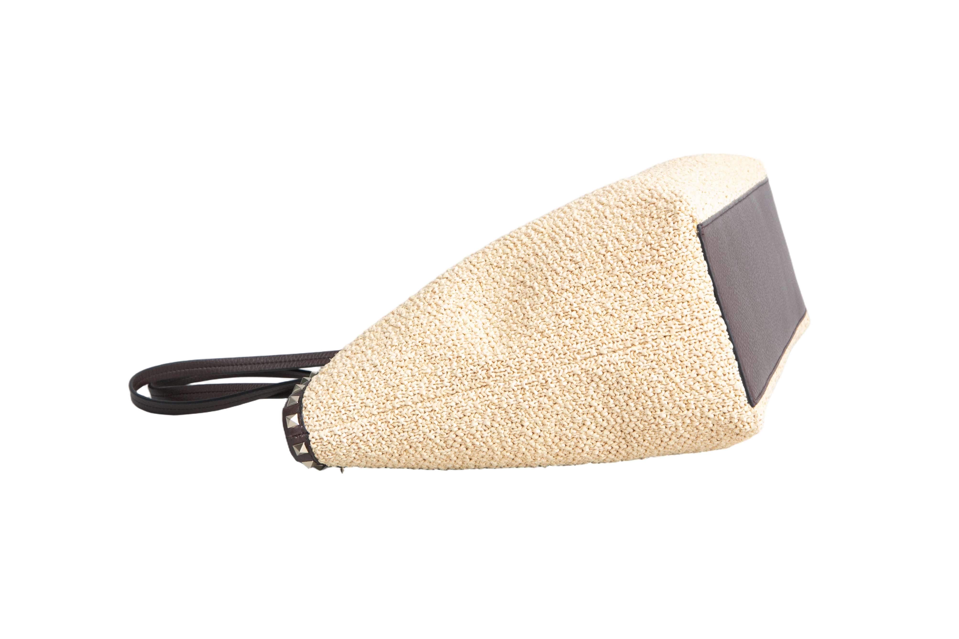 Valentino Rockstud Raffia Tote Natural/Dark Brown. Peça em perfeito estado, possui pequenos sinais de uso na raffia. Acomoda todos os tamanhos de telefone.