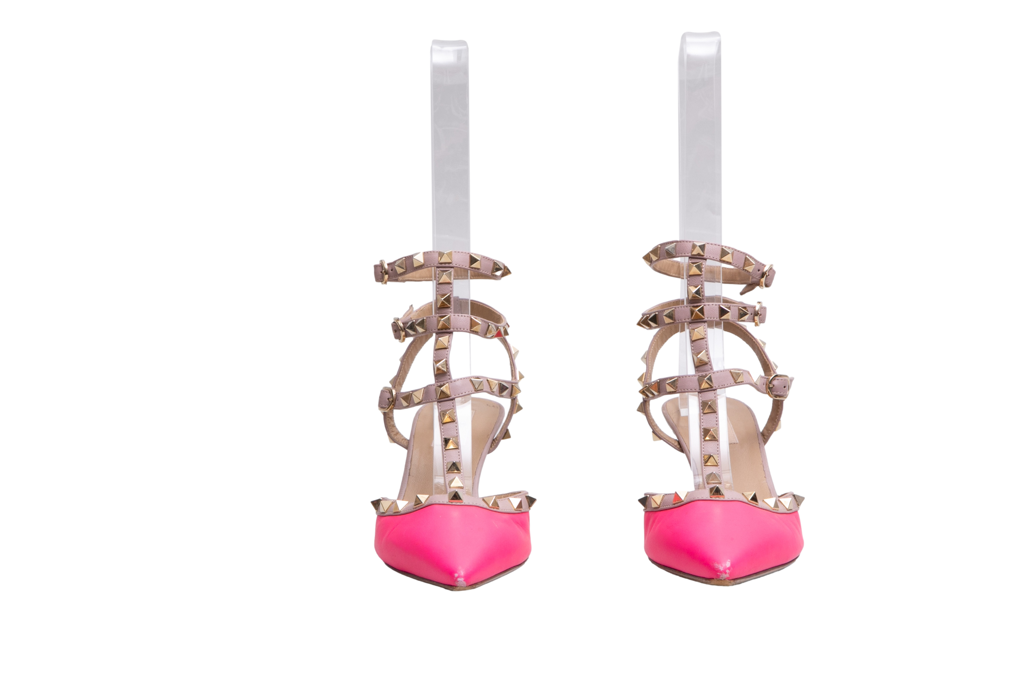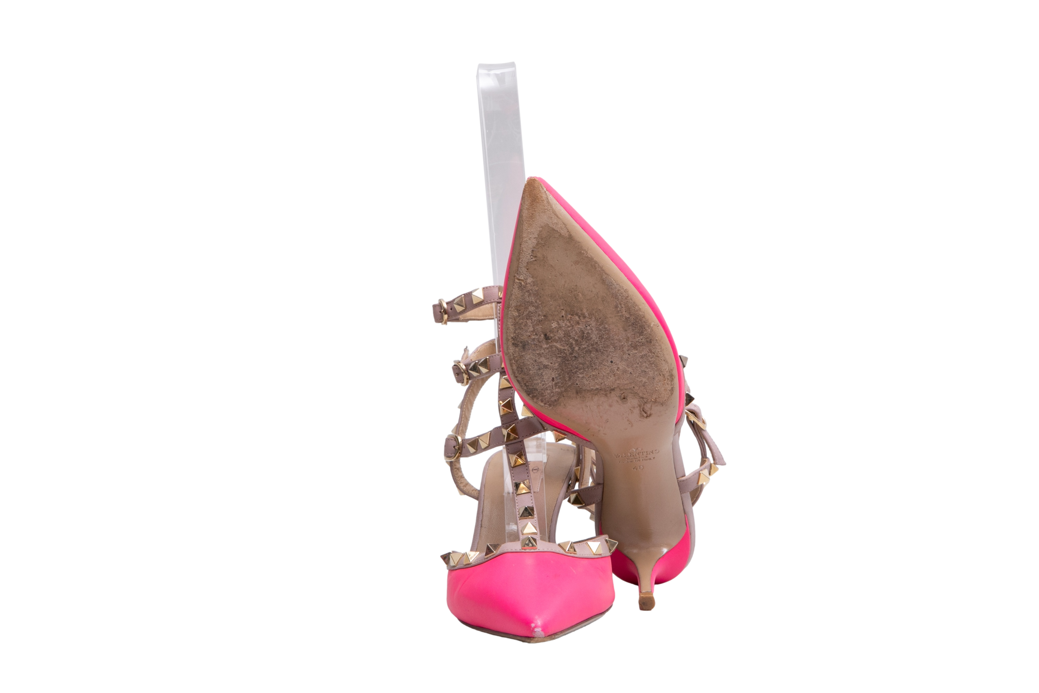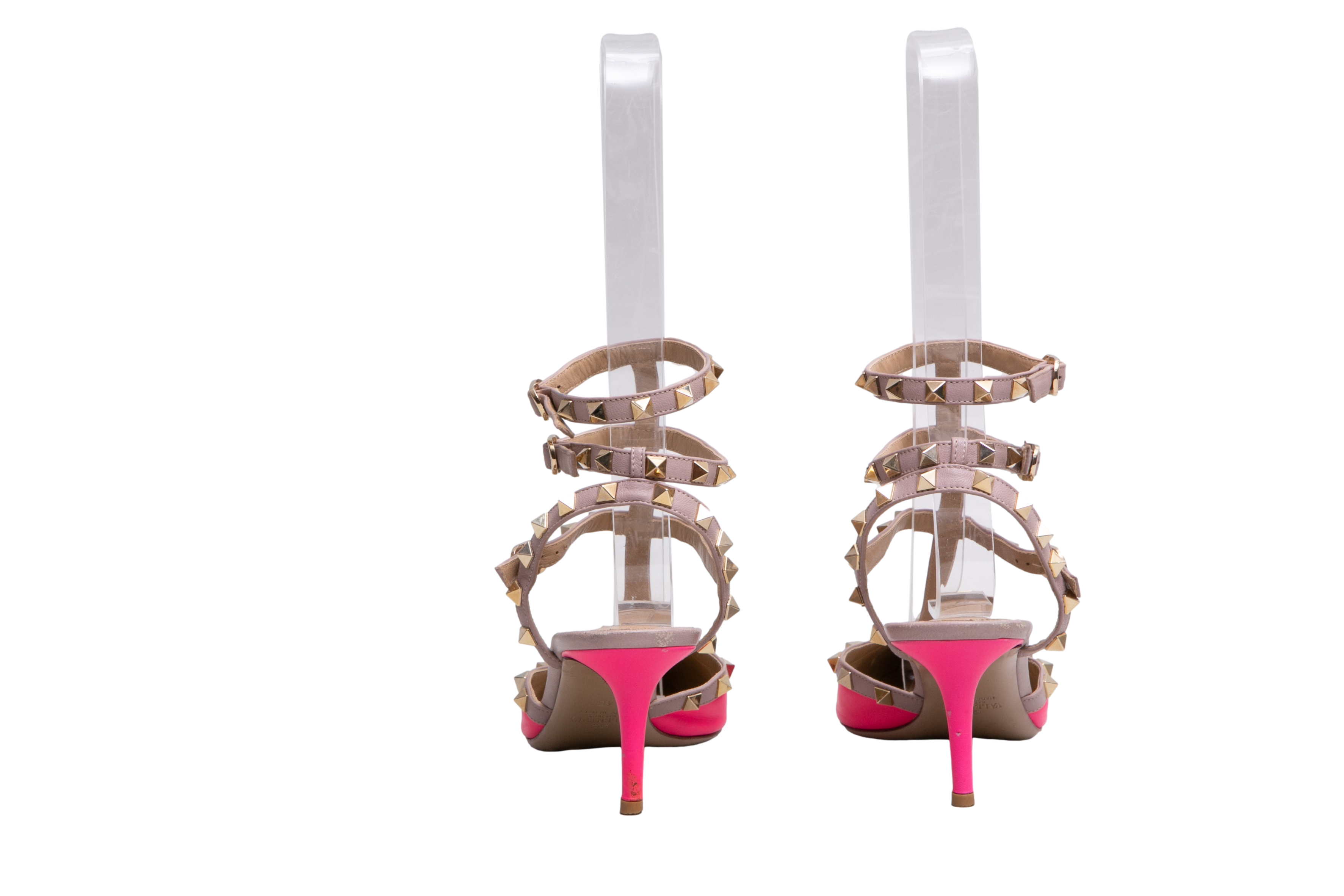Scarpin em couro rosa com acabamento bege, possui tiras ajustáveis com fivelas que envolvem o pé e o tornozelo com studs piramidais distribuídos ao longo das tiras. Salto alto e bico fino.