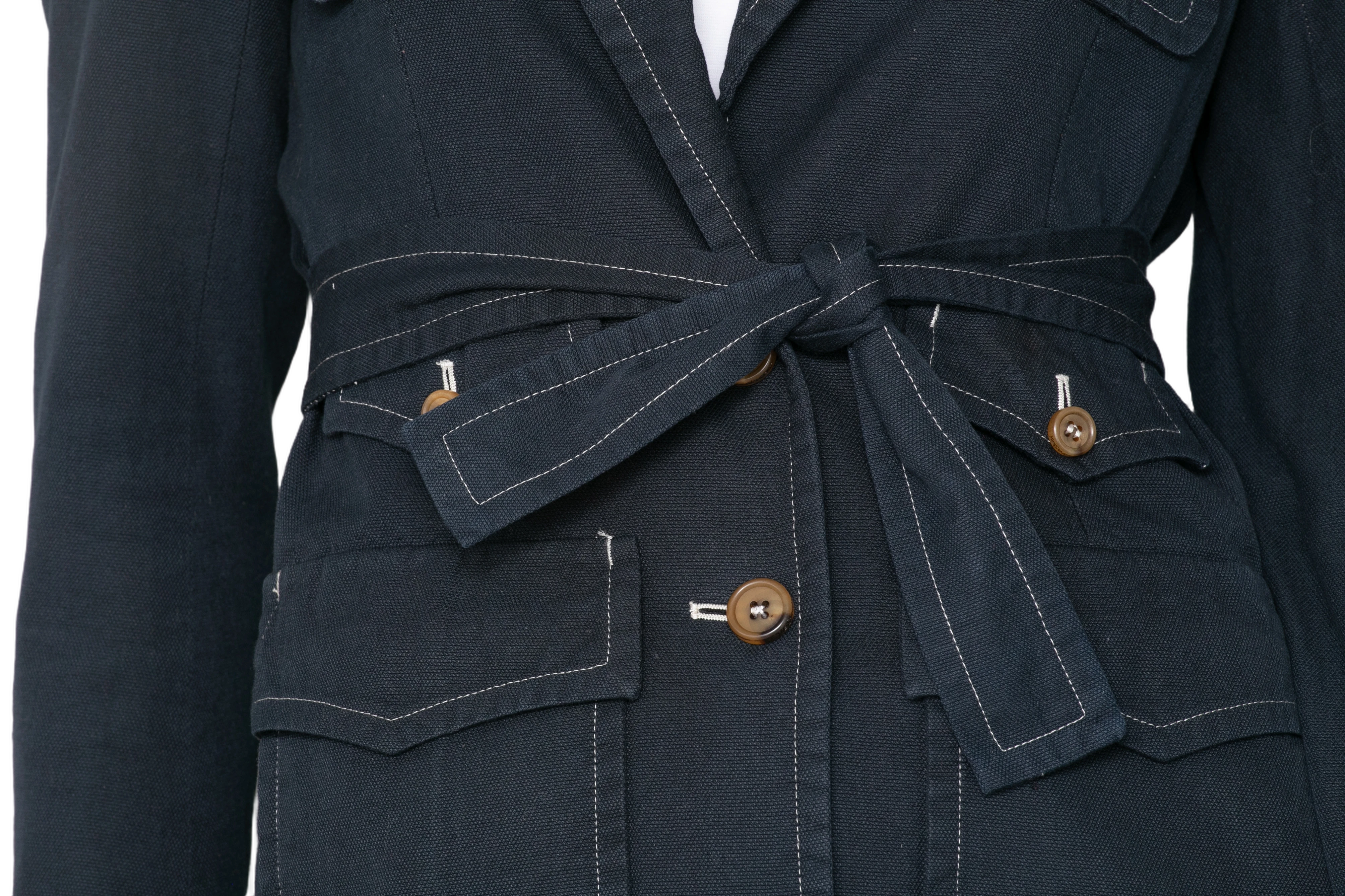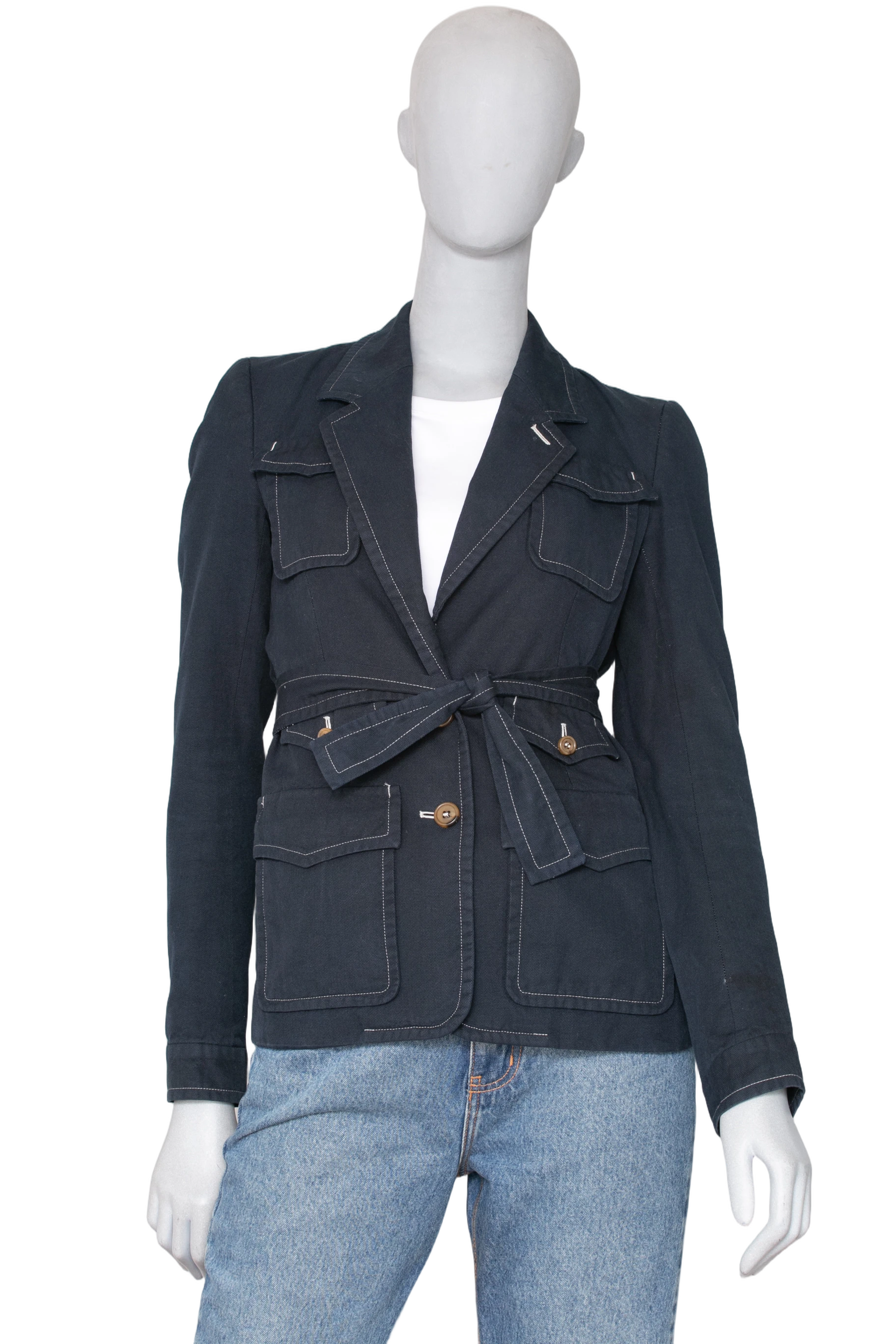 Blazer em tecido azul-marinho, com modelagem estruturada e cinto ajustável na cintura. A peça apresenta lapelas clássicas, bolsos frontais com aba e fechamento por botões.