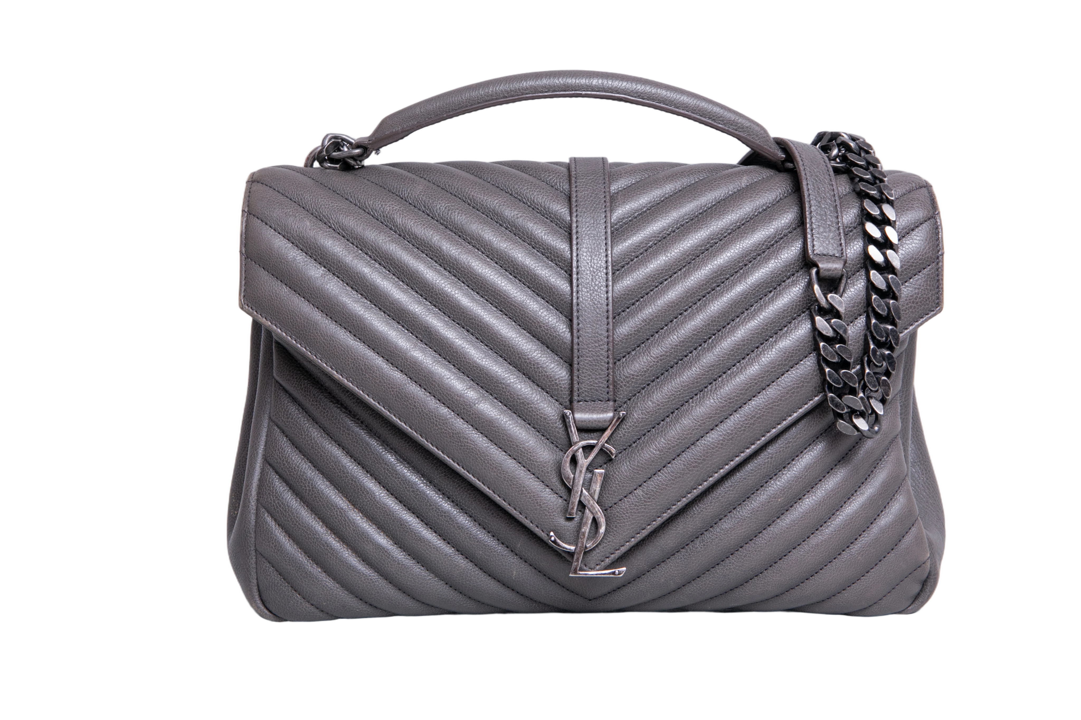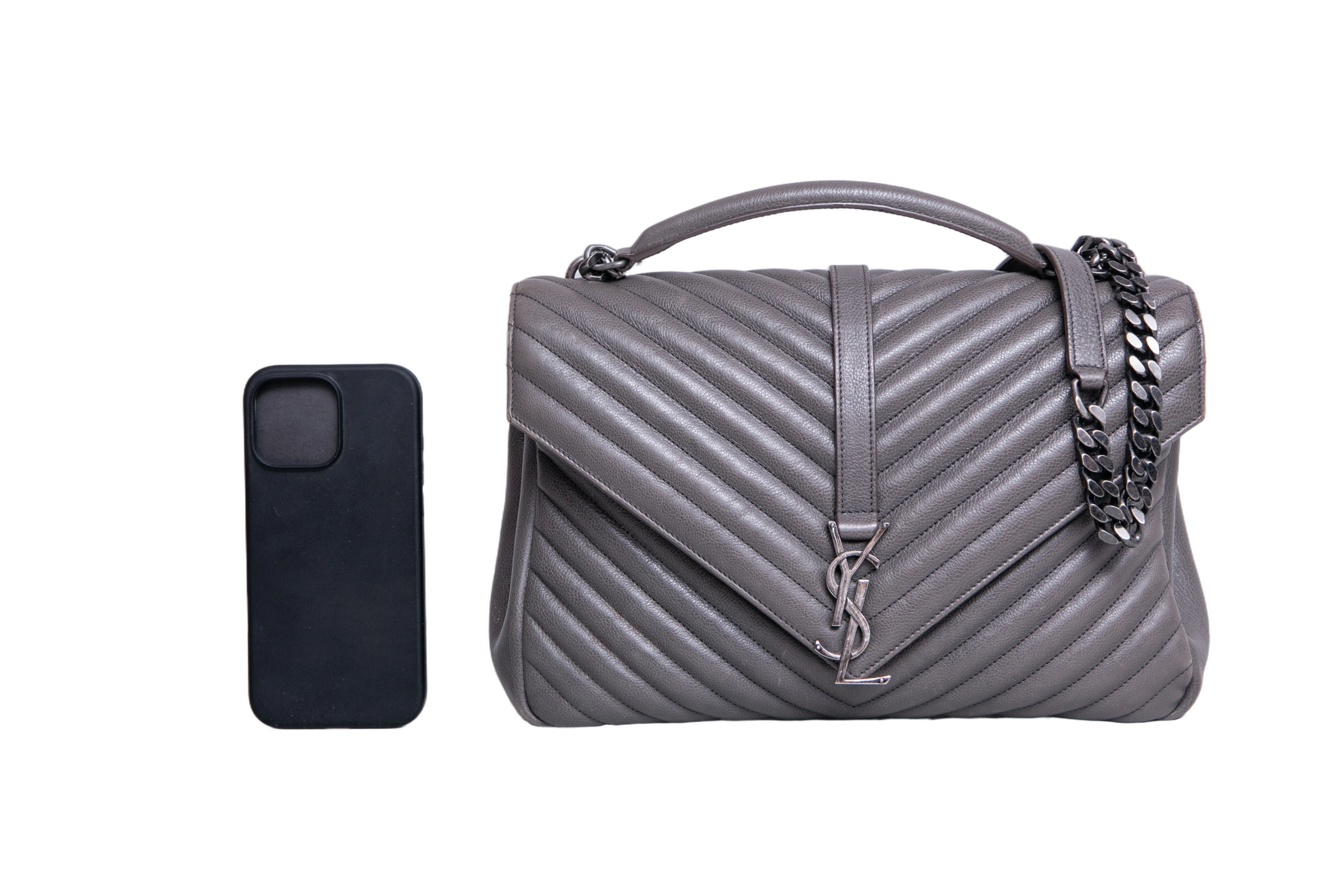 YSL College Chevron Large gray. Peça em ótimo estado, possui sinais nas arestas, couro e forro. Acomoda todos os tamanhos de telefone.