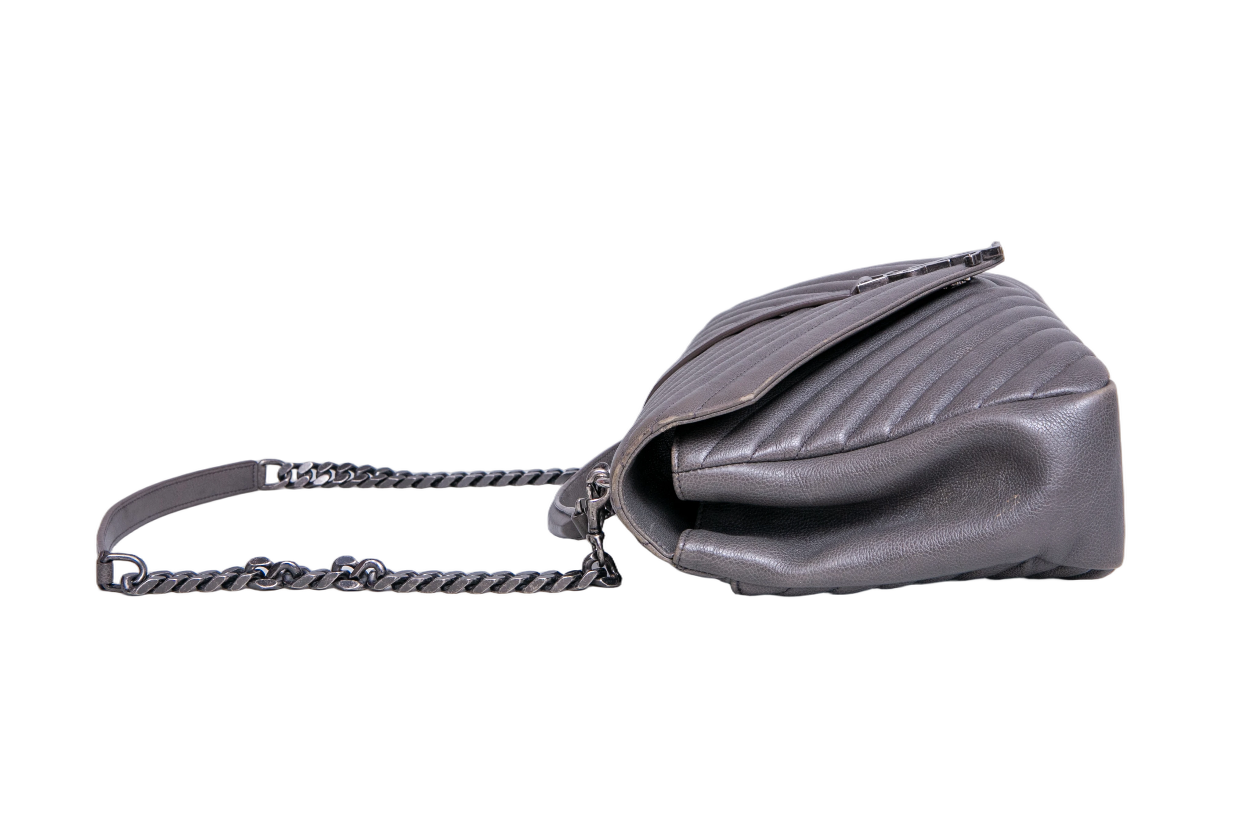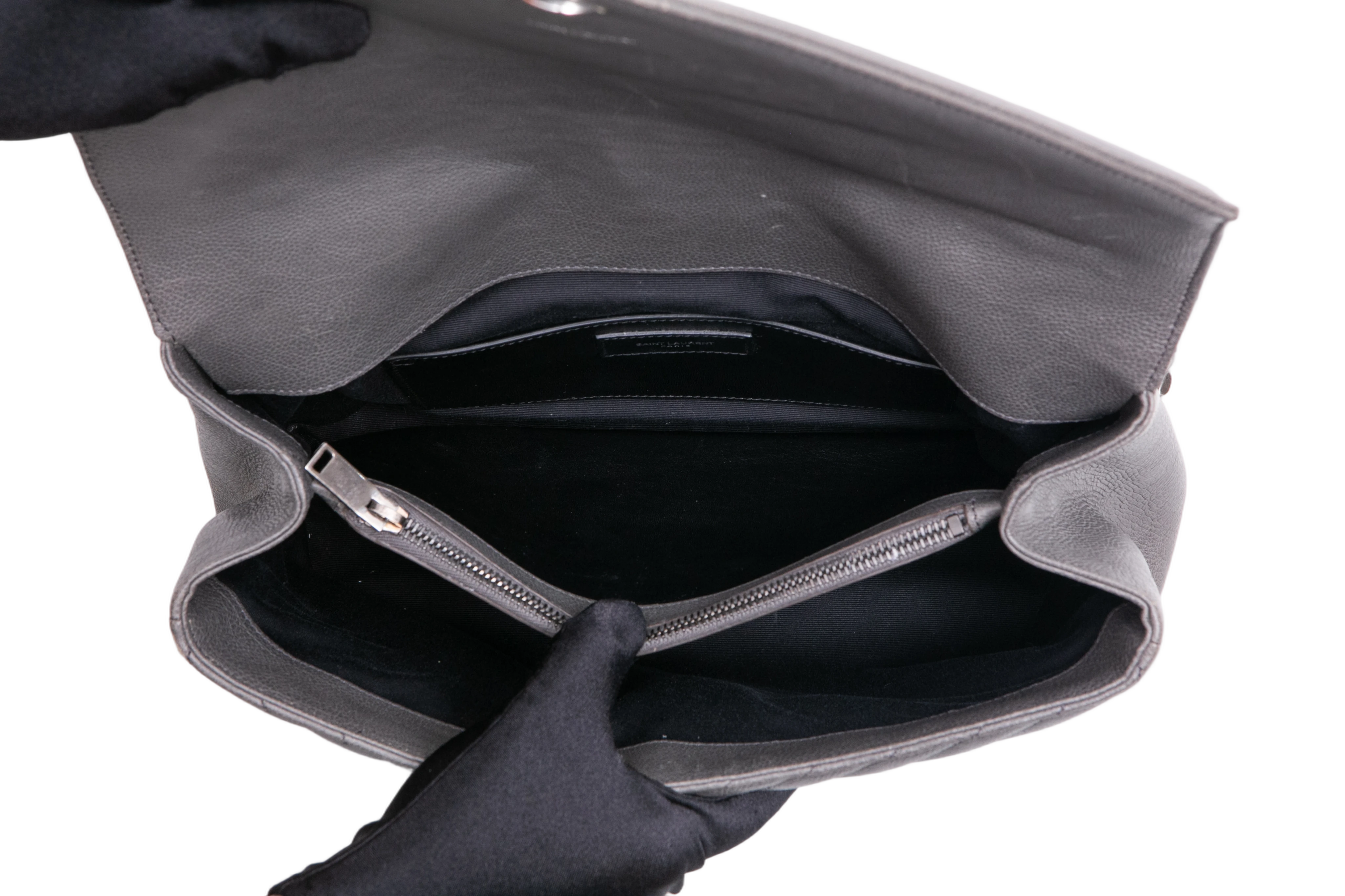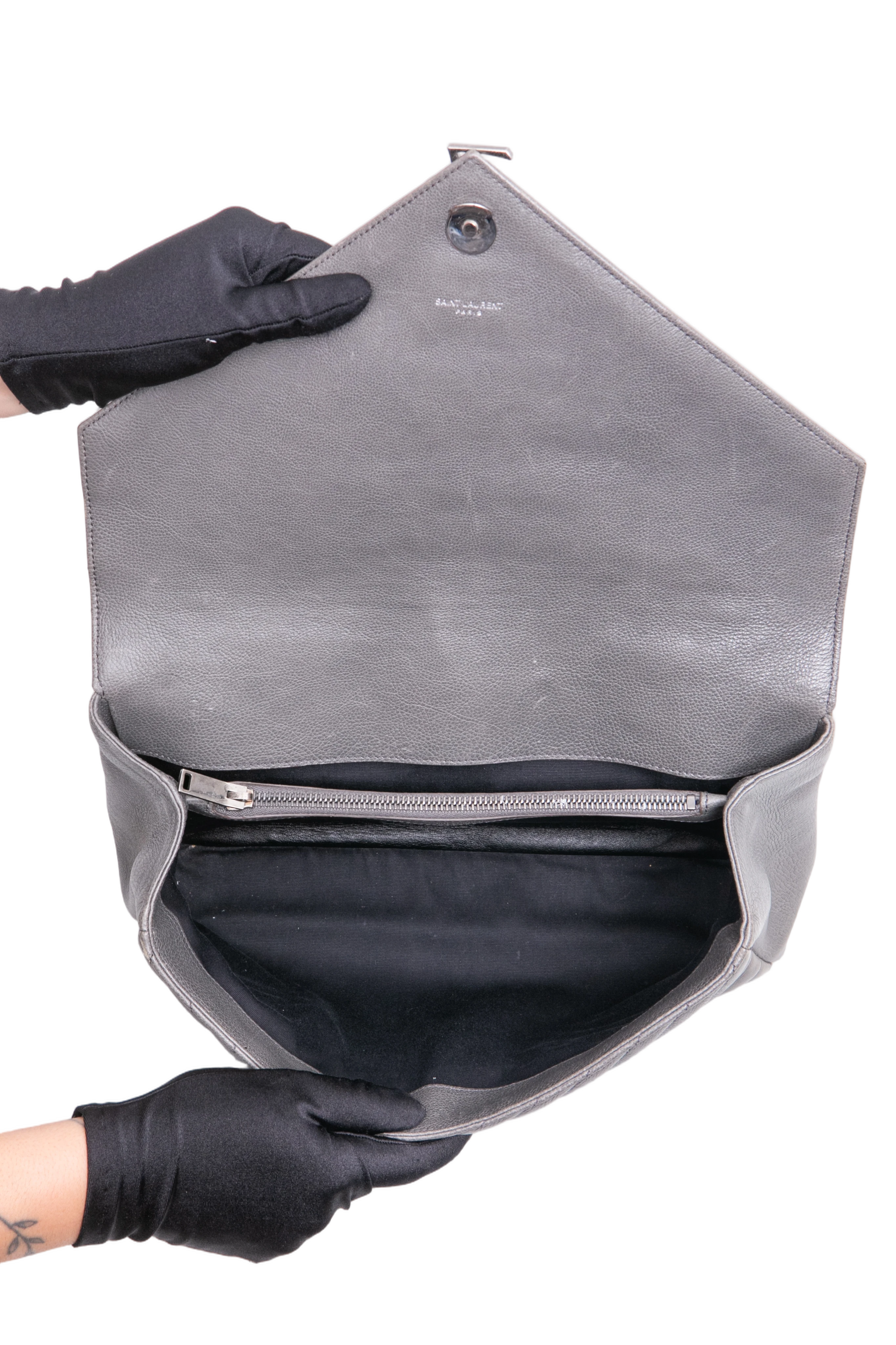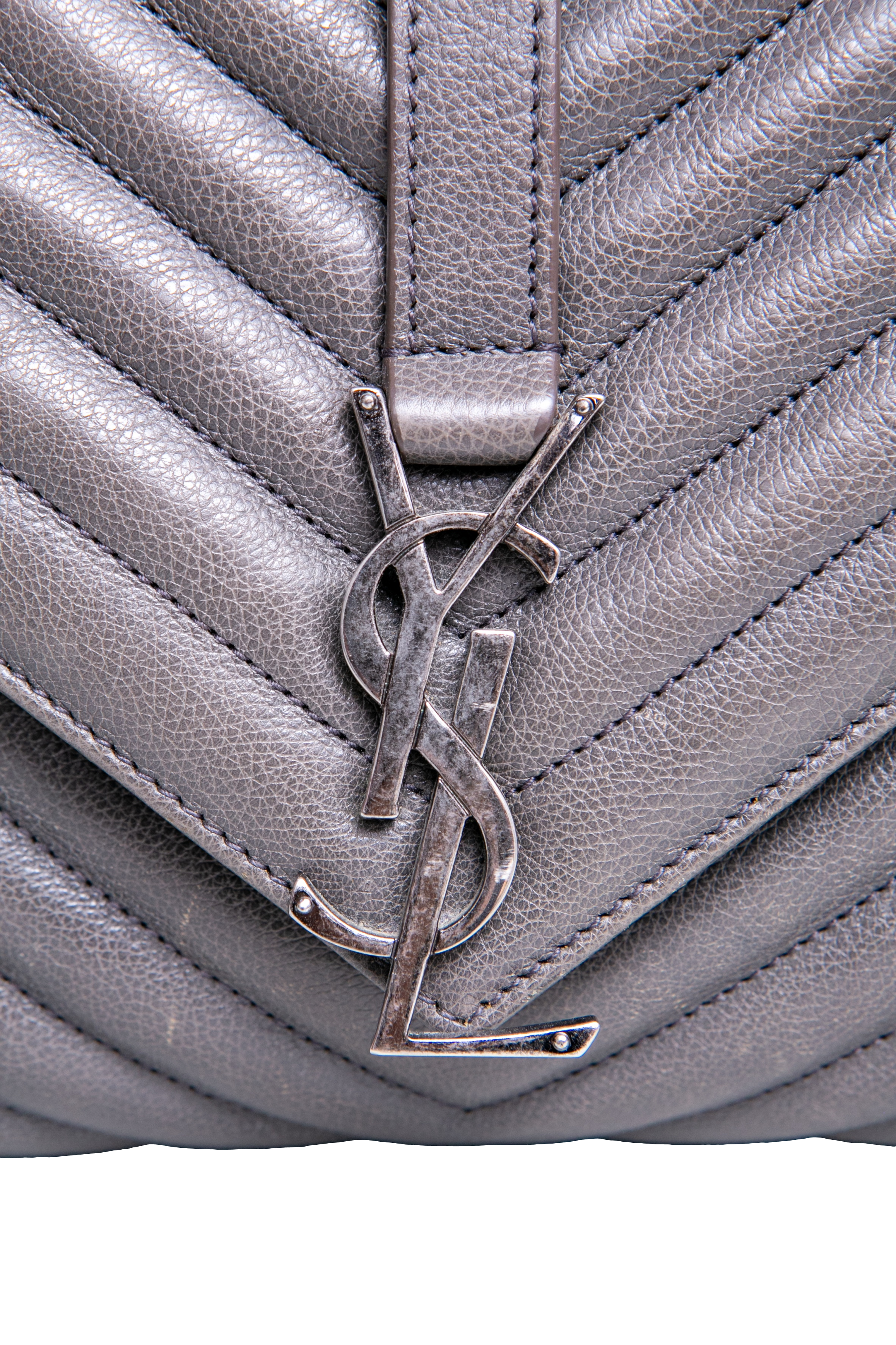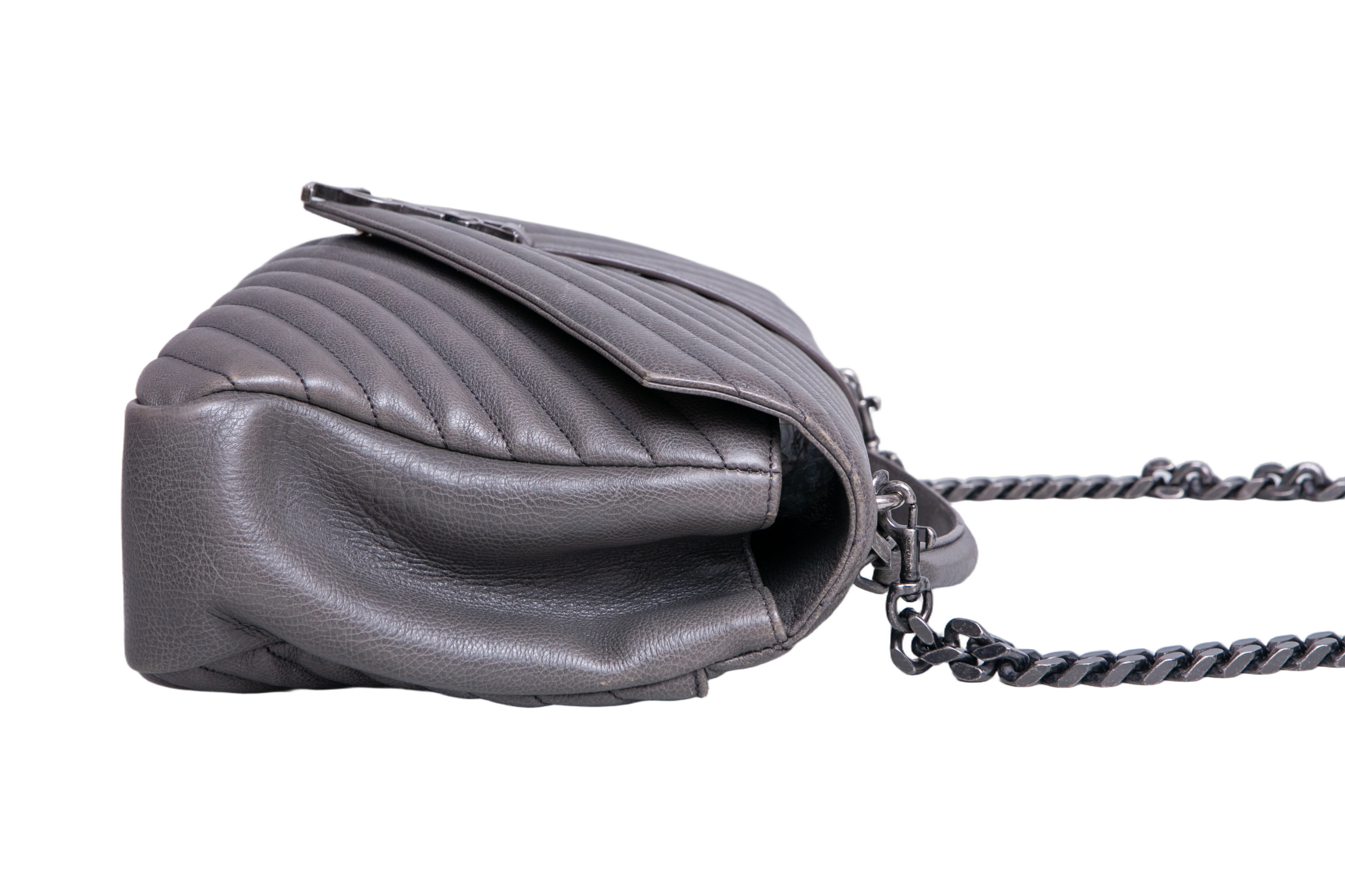 Bolsa em couro matelassê cinza. Fechamento por aba e botão magnético do logo YSL em metal prateado na aba frontal. Possui alça de mão e alça longa em corrente removível, para uso shoulder, crossbody e handle bag
