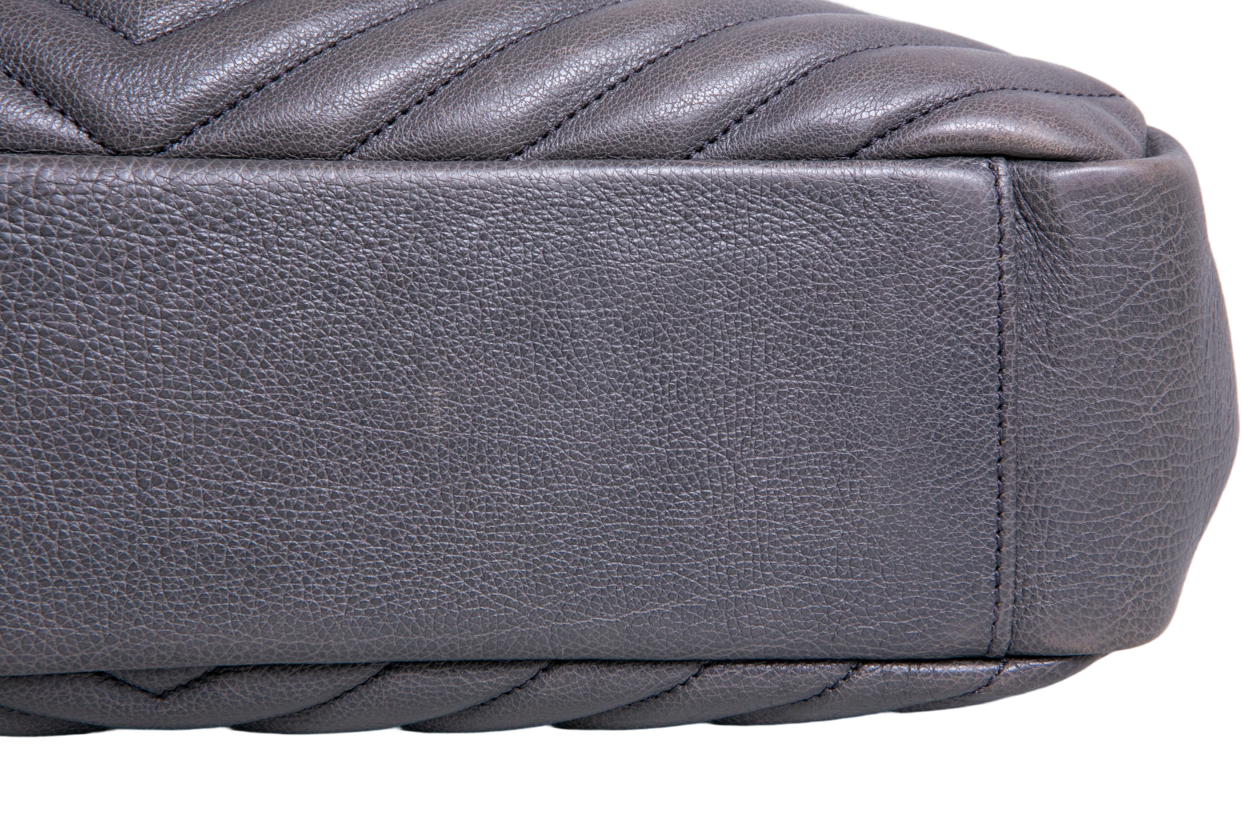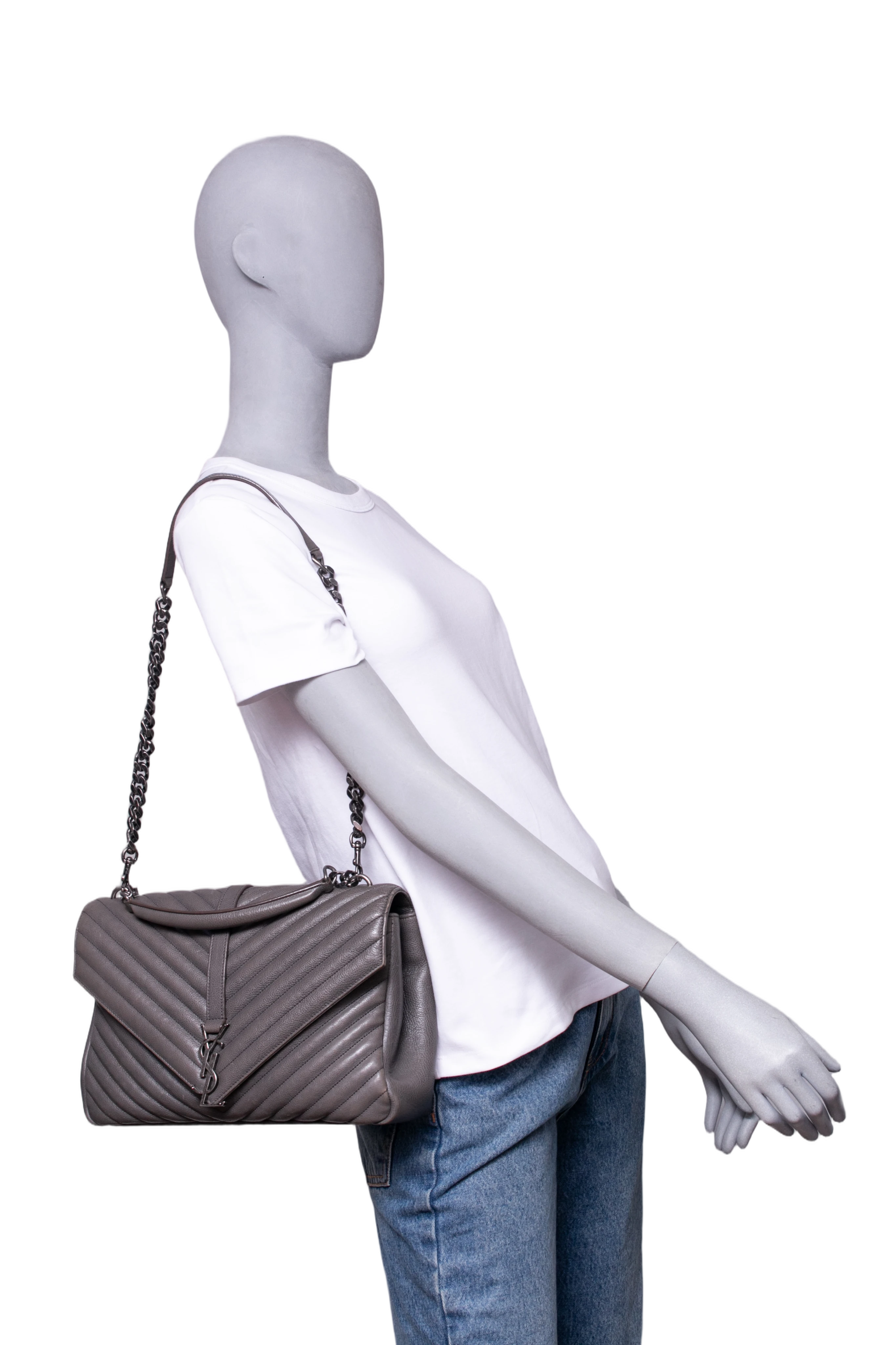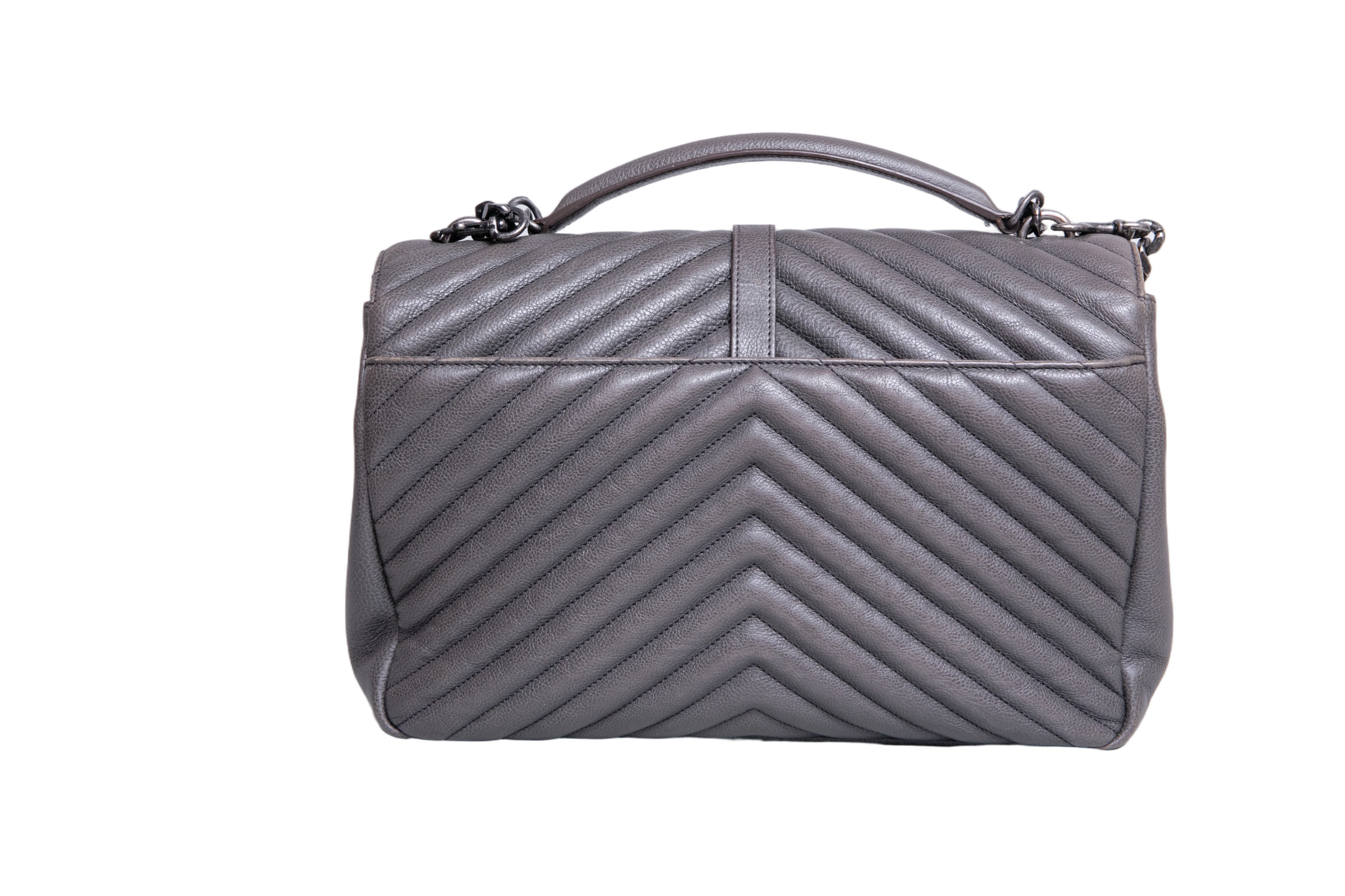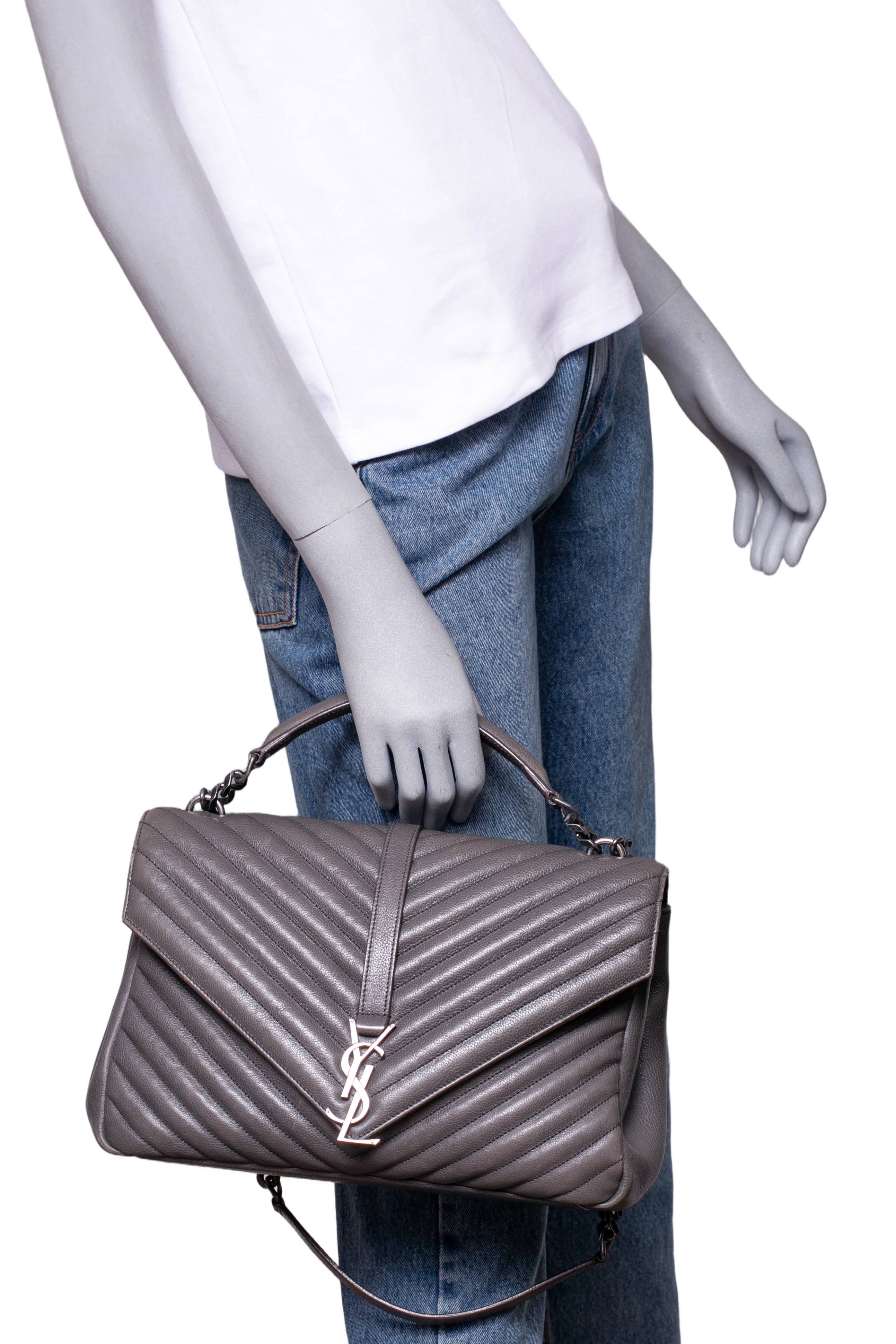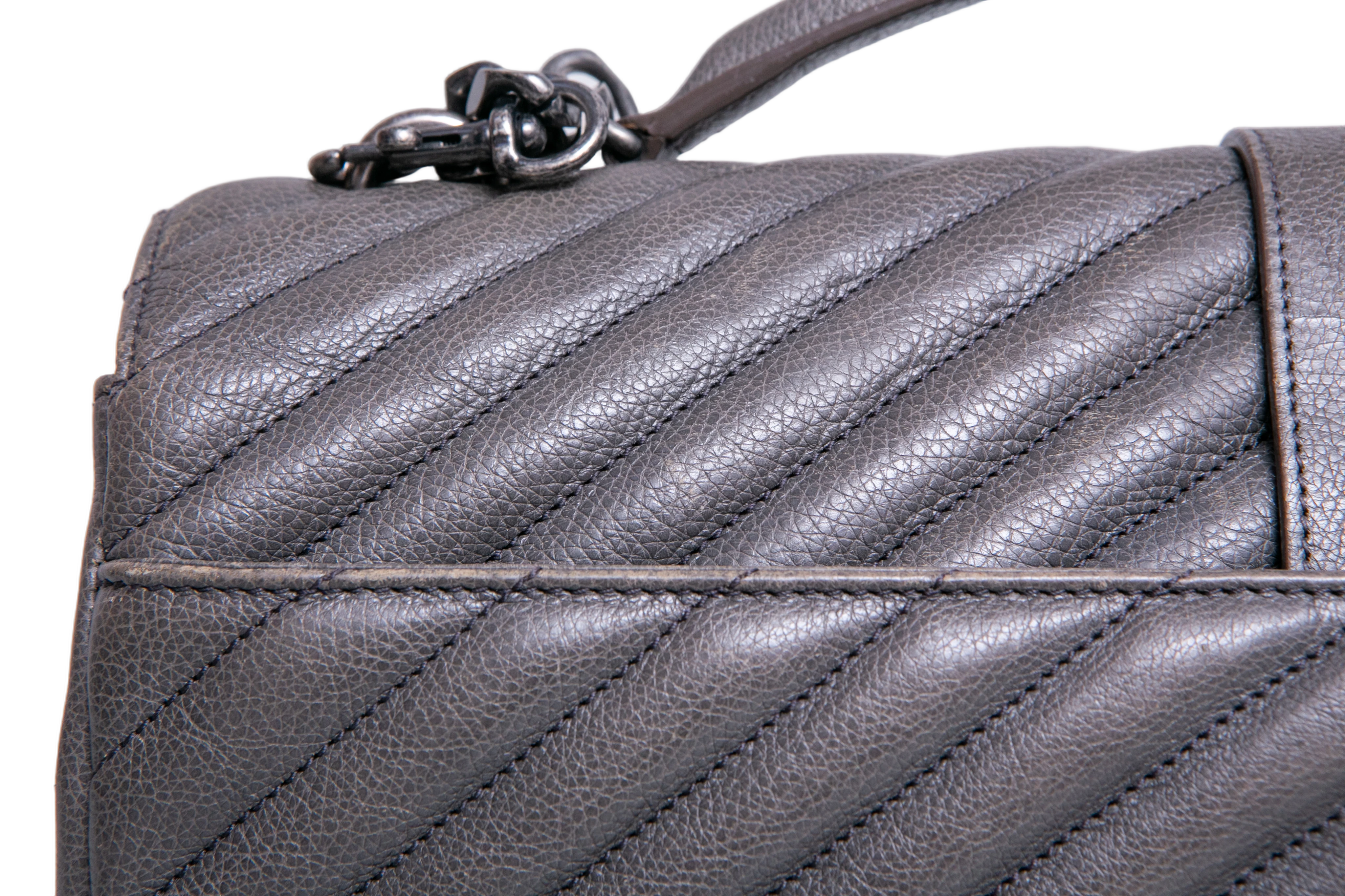 Bolsa em couro matelassê cinza. Fechamento por aba e botão magnético do logo YSL em metal prateado na aba frontal. Possui alça de mão e alça longa em corrente removível, para uso shoulder, crossbody e handle bag