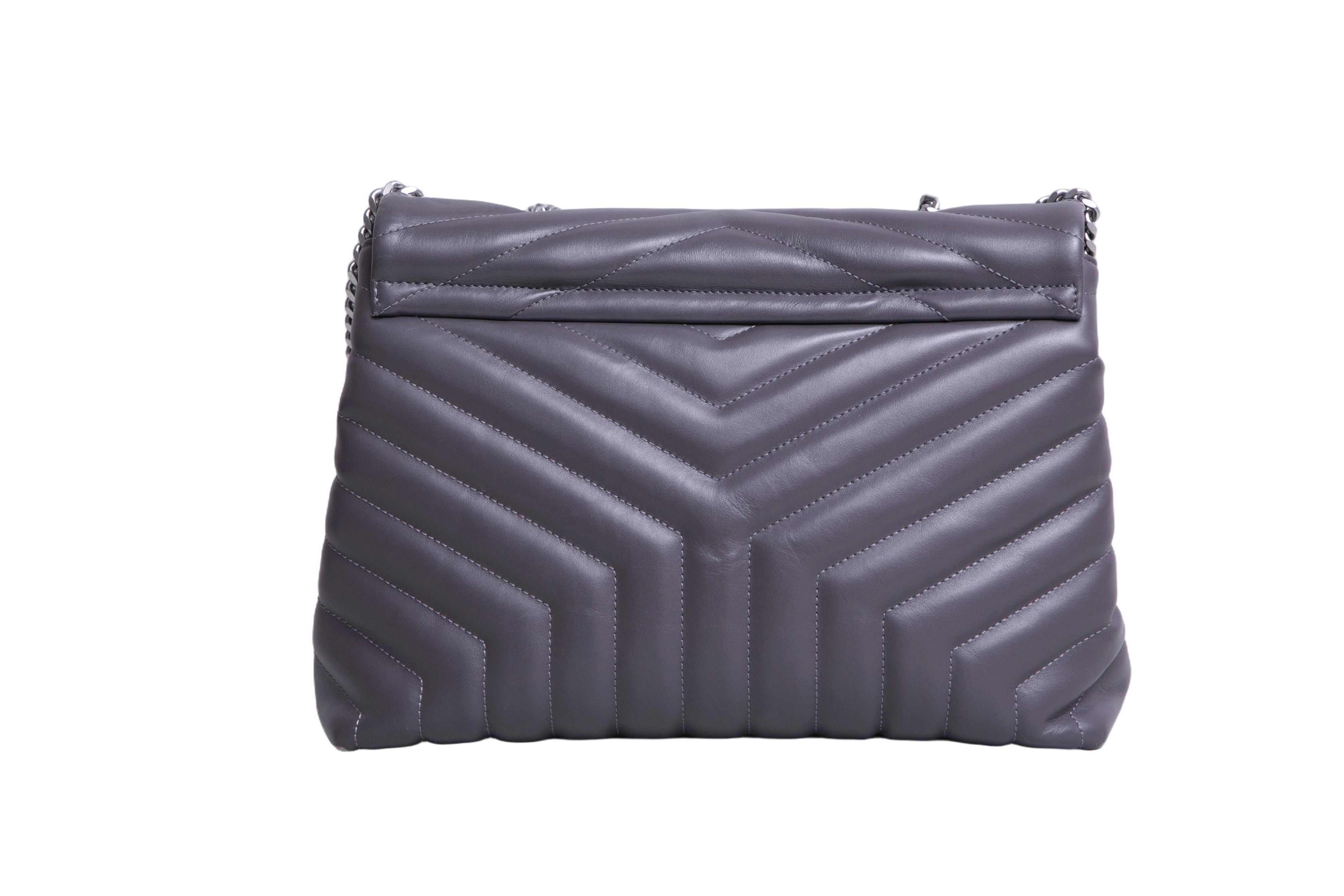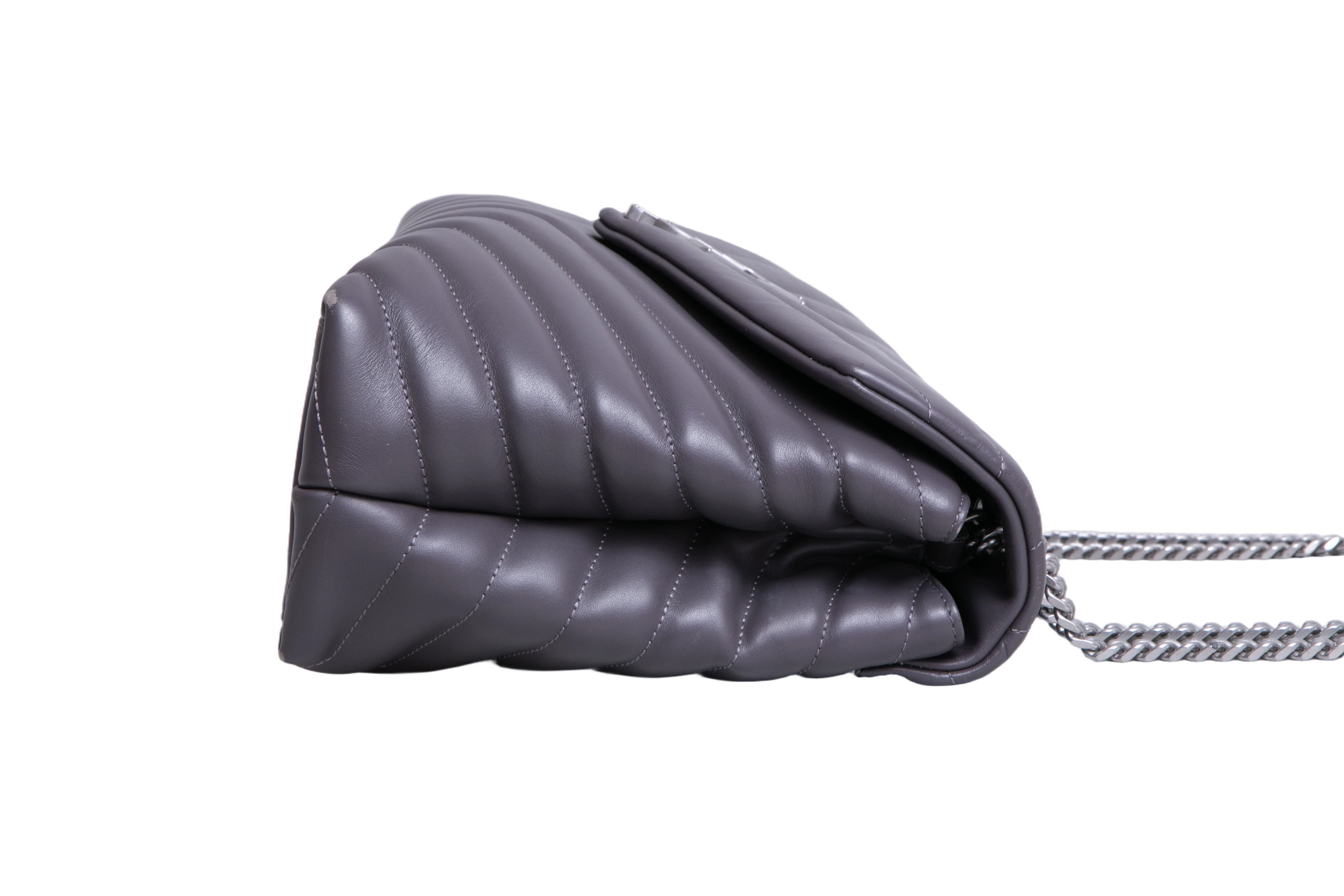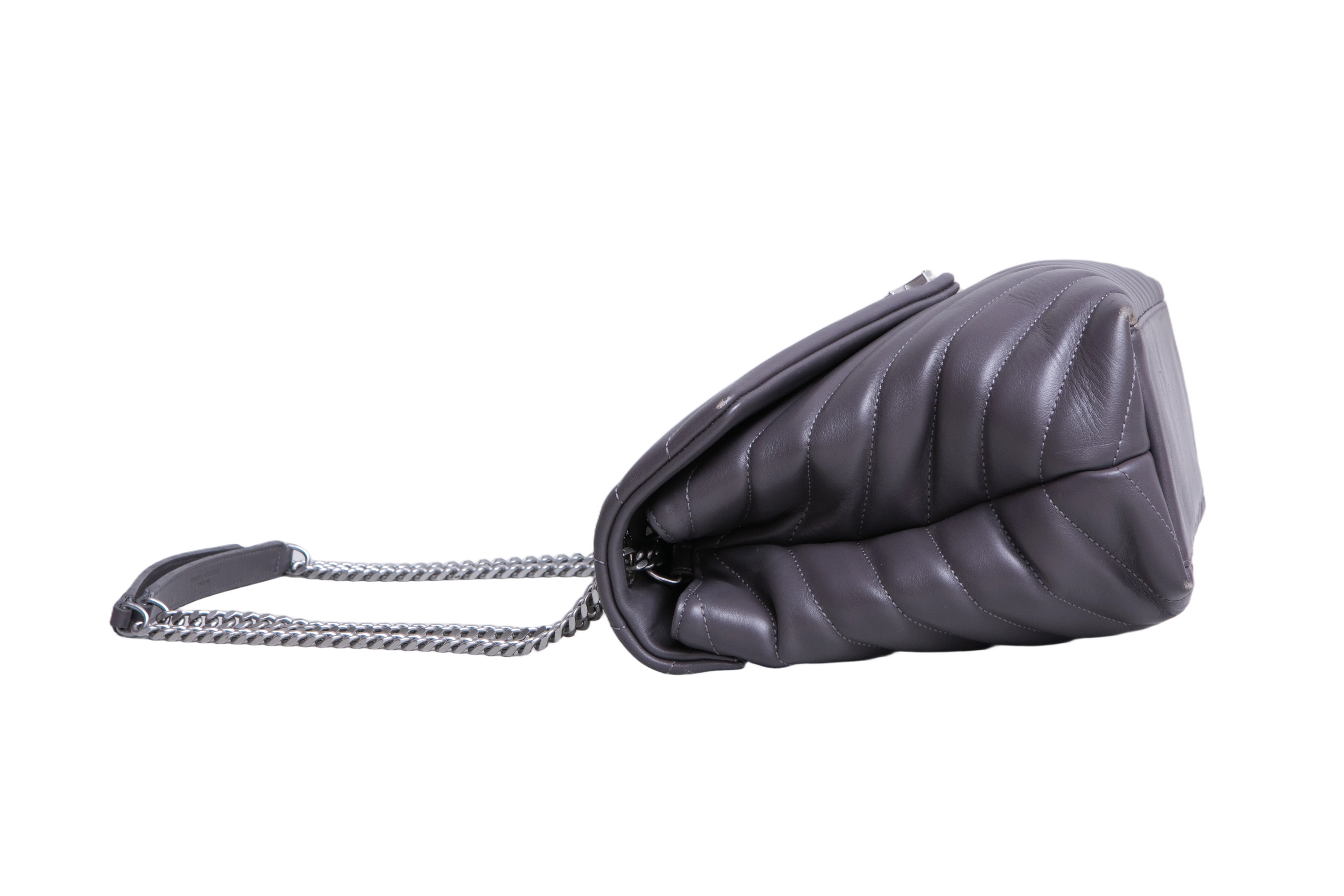 YSL Loulou Medium Chevron Gray. Peça em ótimo estado, possui sinais no couro, na base e ferragens. Acomoda todos os tamanhos de telefone.