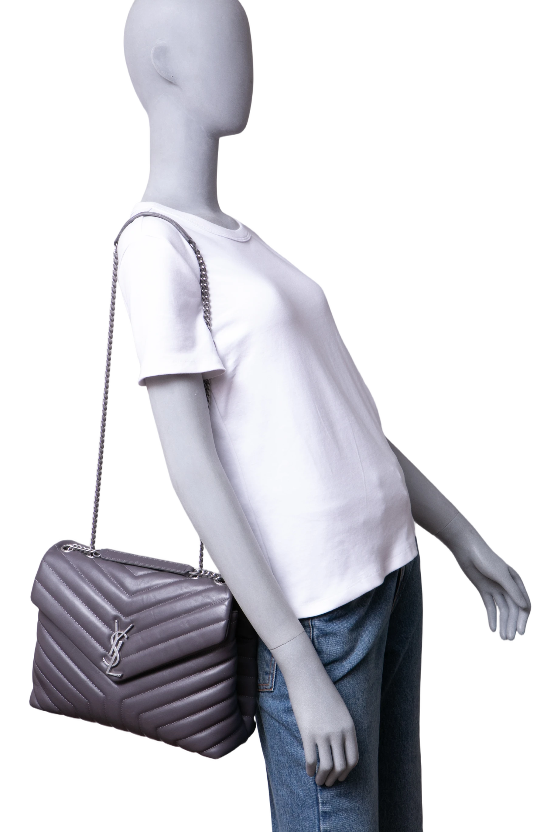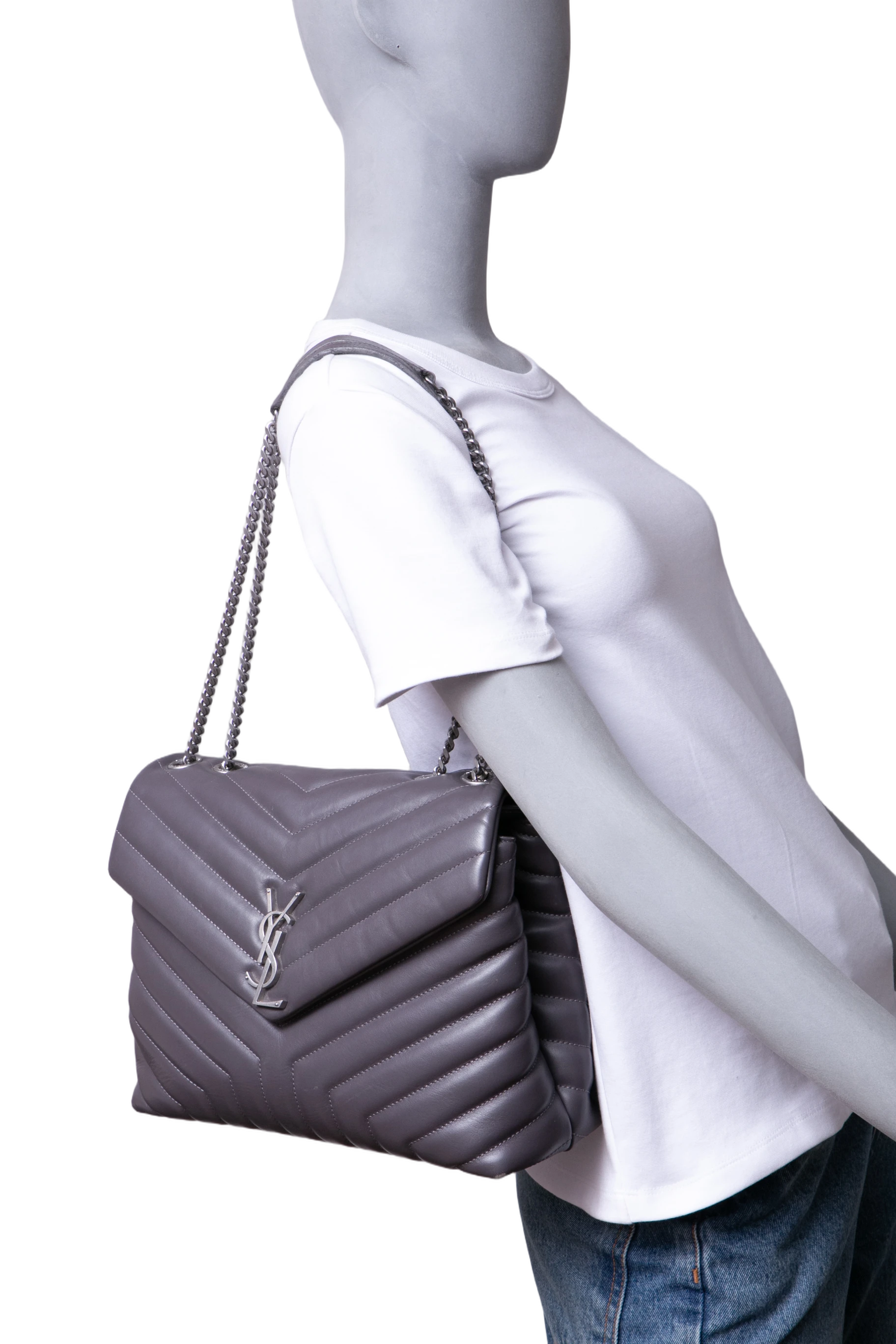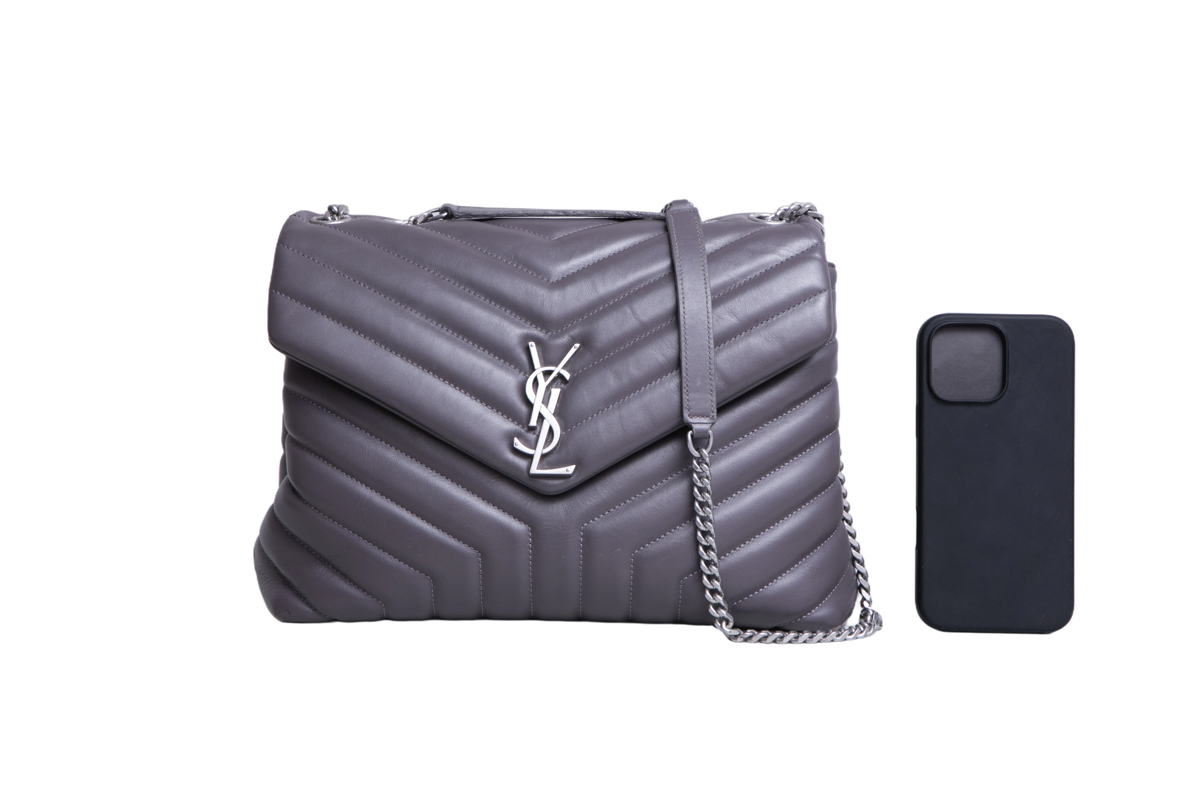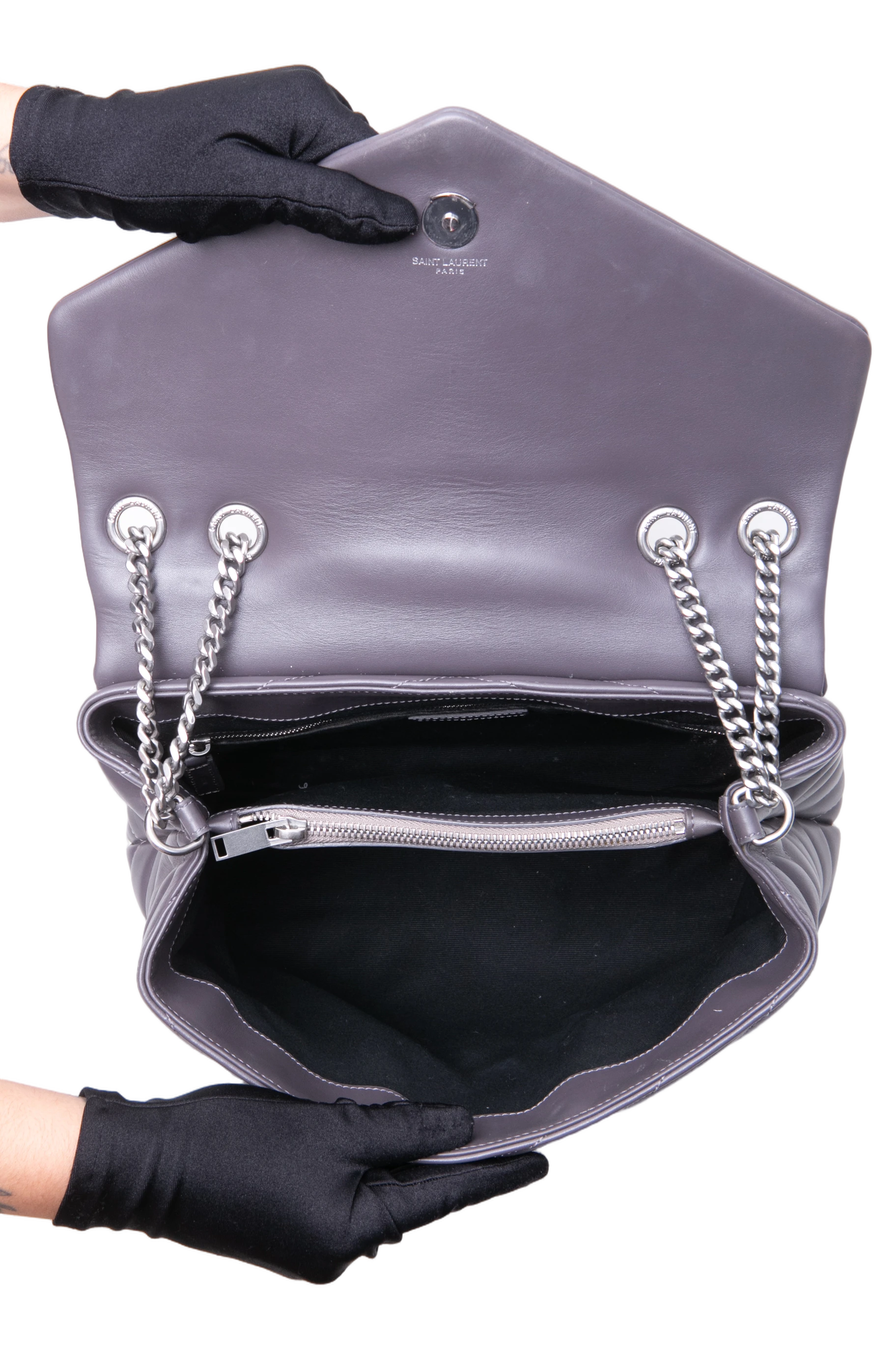 YSL Loulou Medium Chevron Gray. Peça em ótimo estado, possui sinais no couro, na base e ferragens. Acomoda todos os tamanhos de telefone.