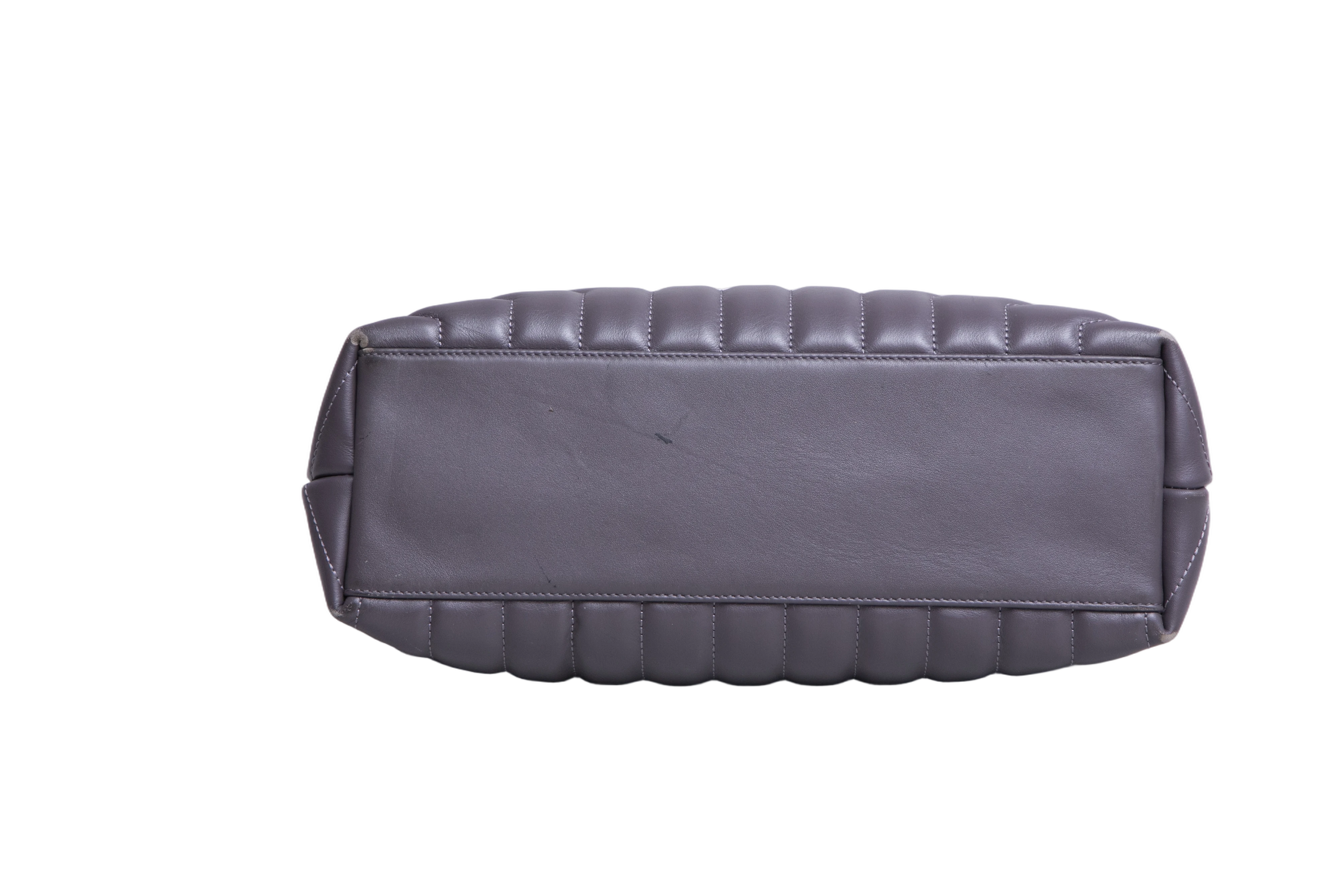 Bolsa em couro matelassê chevron na cor cinza, fechamento por aba com botão magnético. Possui alça em corrente com ombreira, para uso shoulder e crossbody.