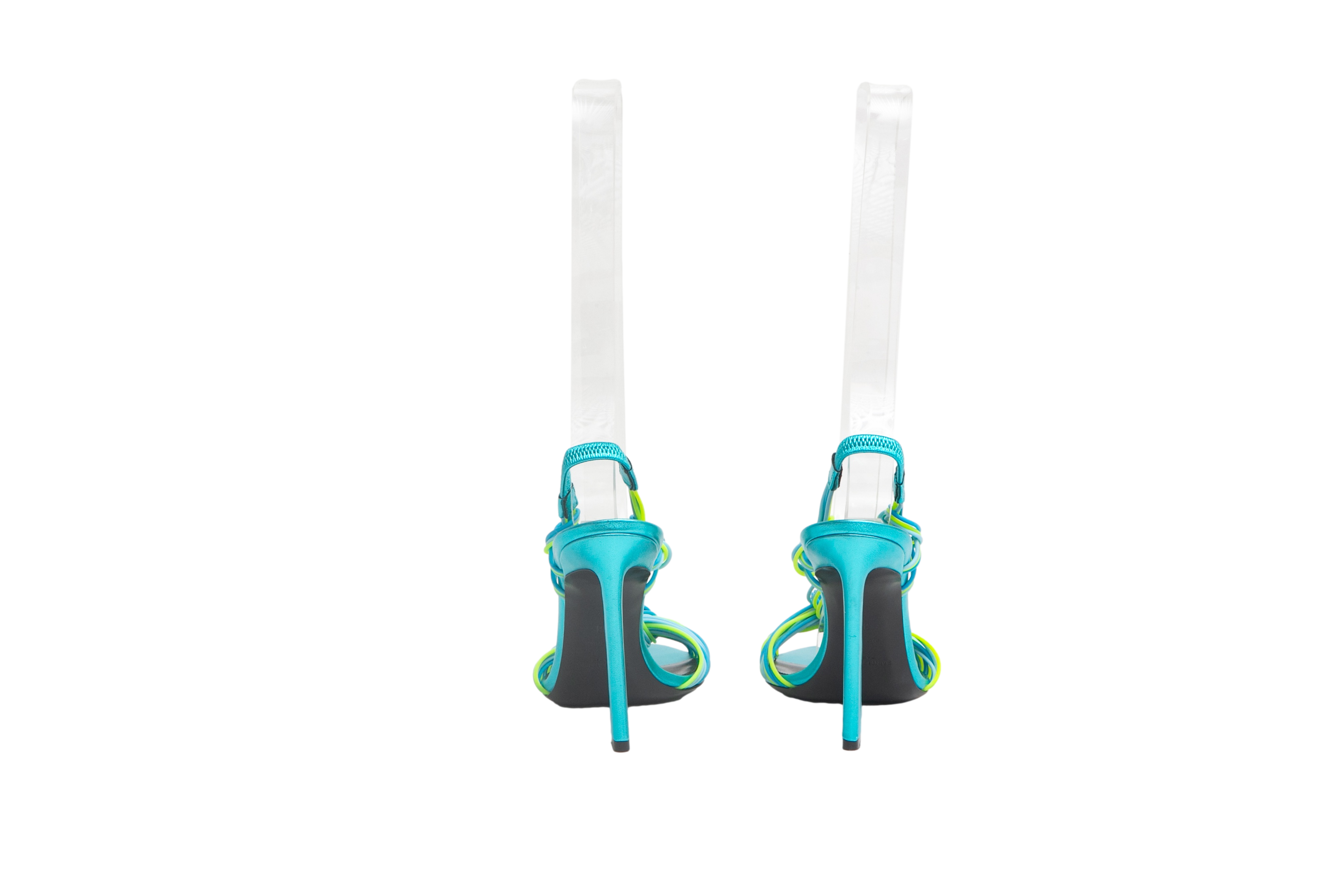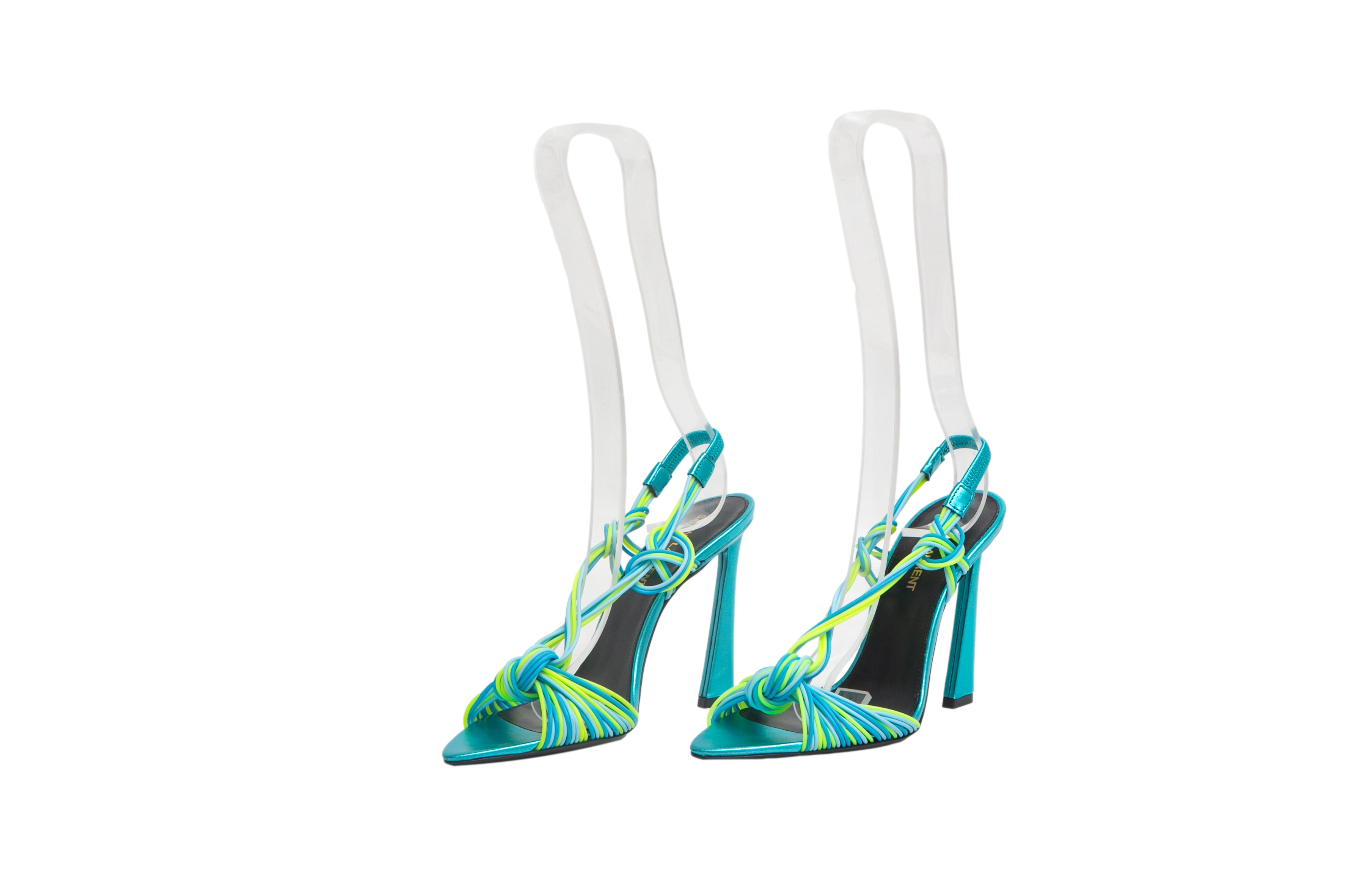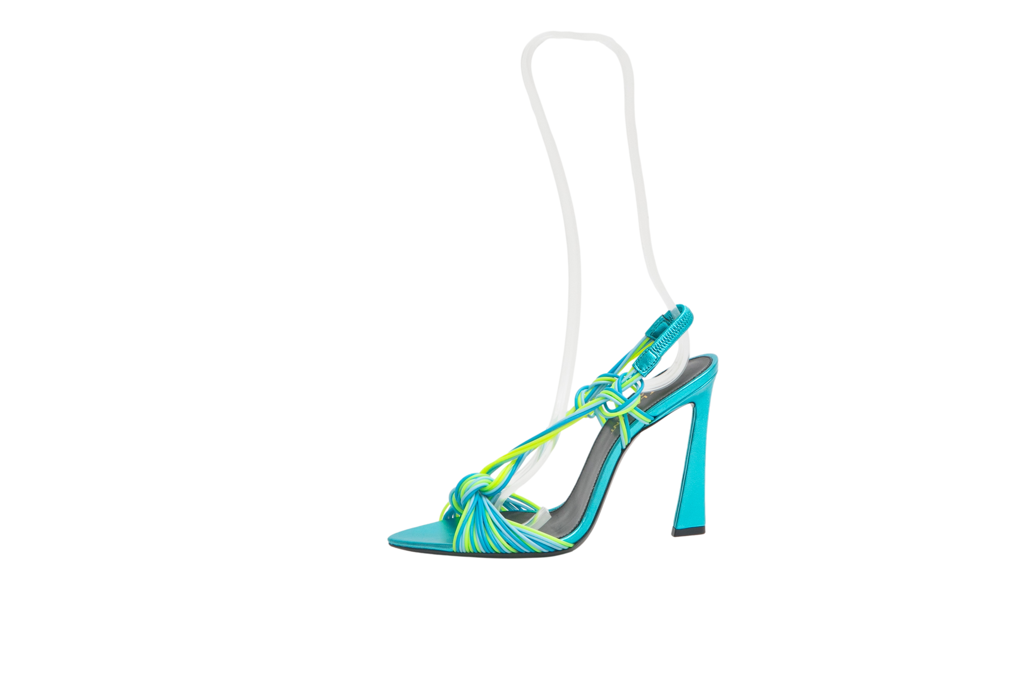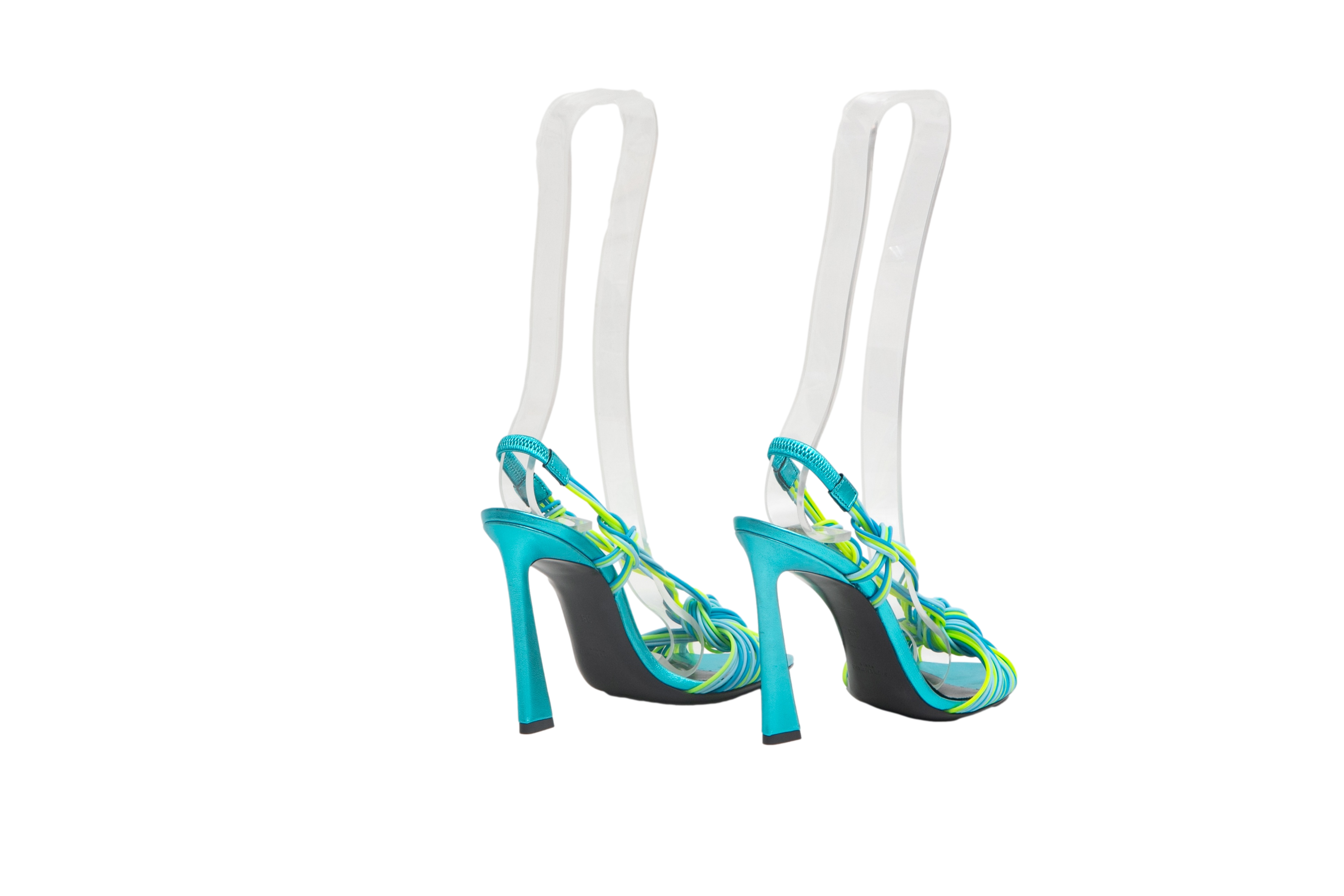As cores Cerulian (um tom vibrante de azul) e Giallo Fluo (um amarelo fluorescente intenso) criam um contraste moderno e ousado, perfeito para quem gosta de ousar com personalidade e sofisticação. A sandália combina perfeitamente com looks mais minimalistas, nos quais ela se torna a peça central, ou pode compor produções mais fashionistas, elevando ainda mais o visual. Com tiras finas entrelaçadas e acabamento impecável, é uma expressão autêntica de luxo criativo e atitude fashion.