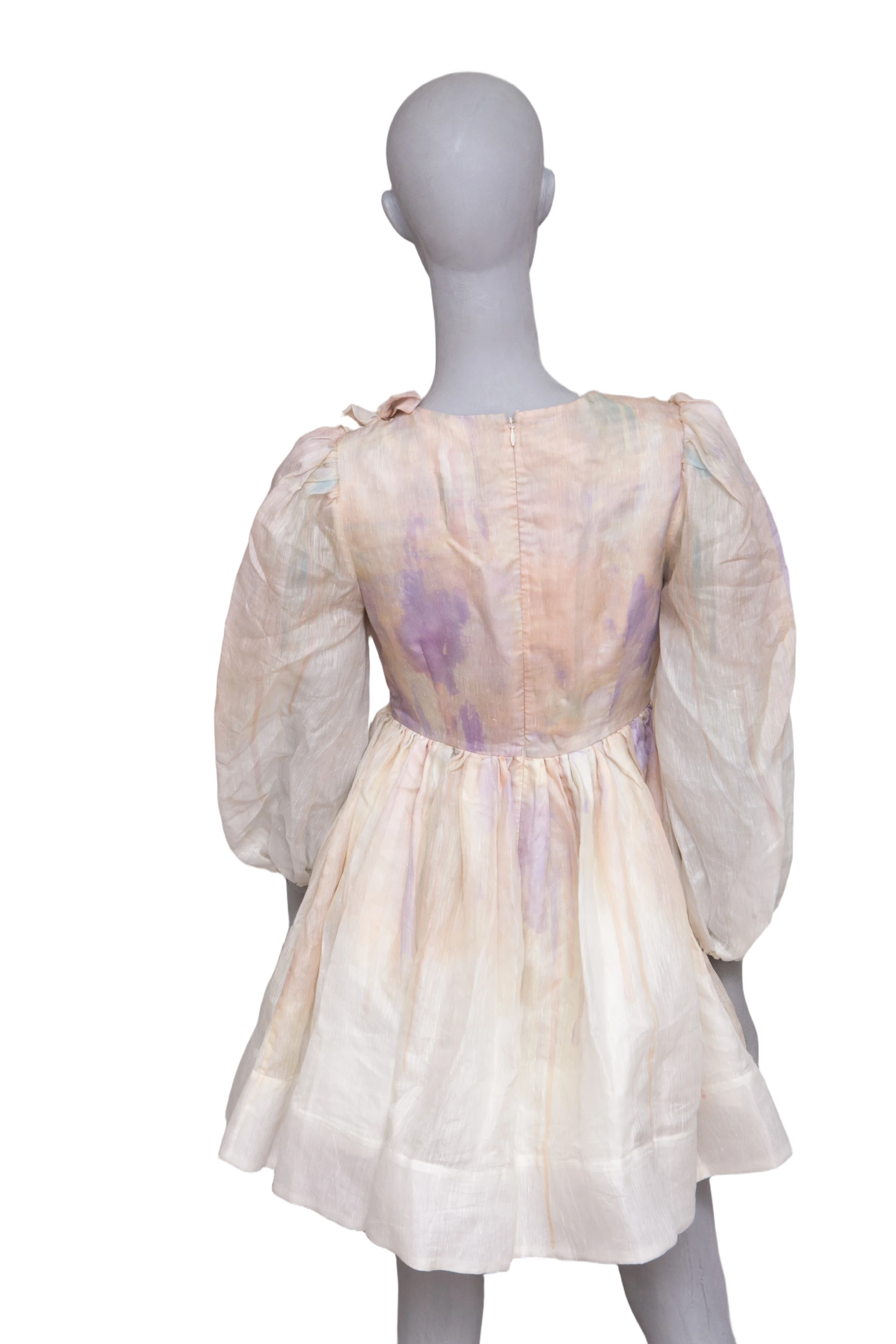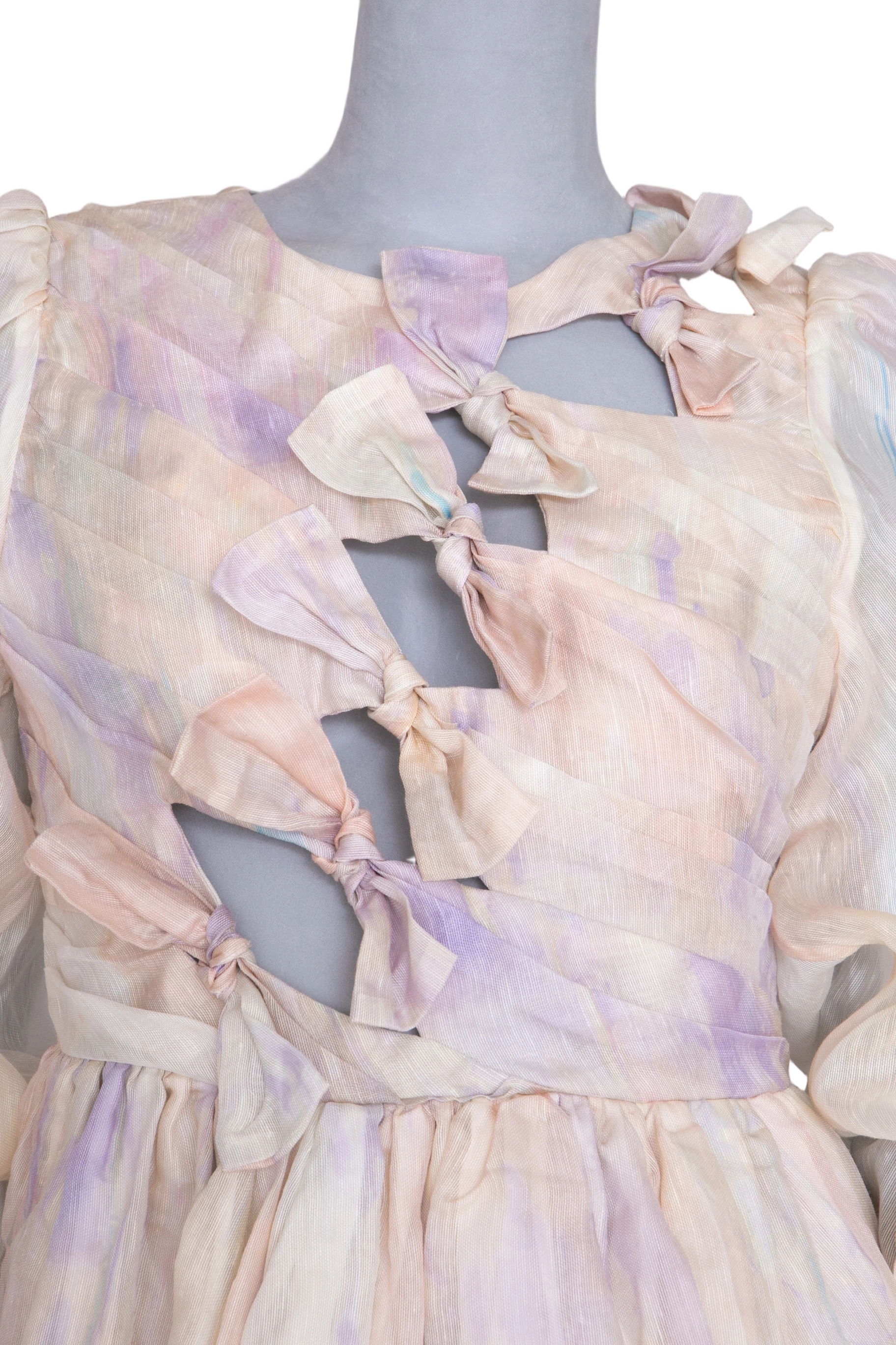 Vestido curto confeccionado em tecido leve com estampa em efeito aquarelado em tons suaves de lilás, pêssego e off-white. O modelo possui mangas longas bufantes com punhos elásticos, decote redondo e detalhe frontal de recortes com laços aplicados.